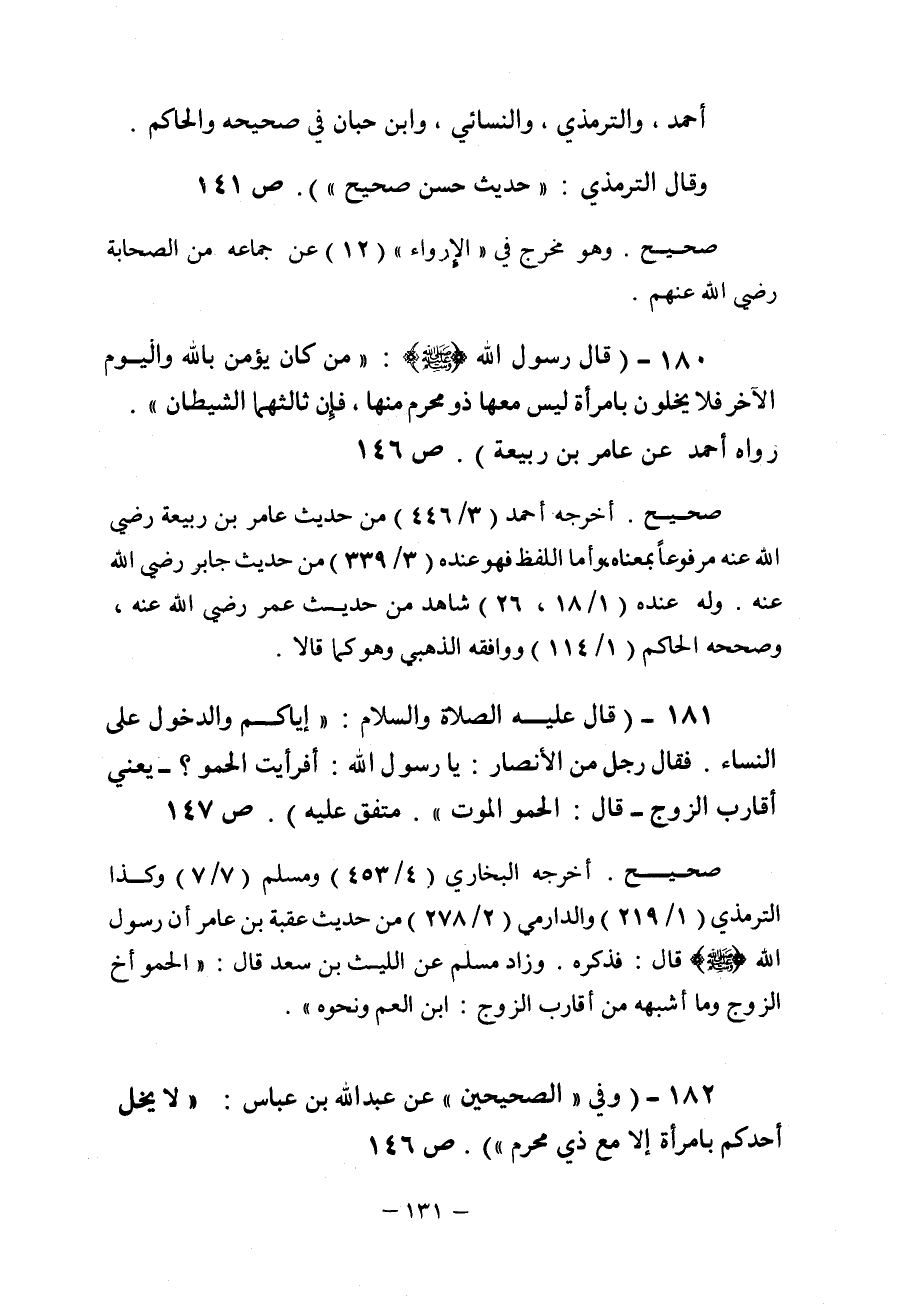 قال E: إياكم والدخول على النساء فقال رجل من الأنصار: يا رسول الله: أفرأيت الحمو يعني أقارب الزوج قال: الحمو الموت متفق عليه أخرجه البخاري ومسلم والترمذي والدارمي وزاد مسلم عن الليث بن سعد قال: الحمو أخ الزوج وما أشبهه من أقارب الزوج ابن العم ونحوه