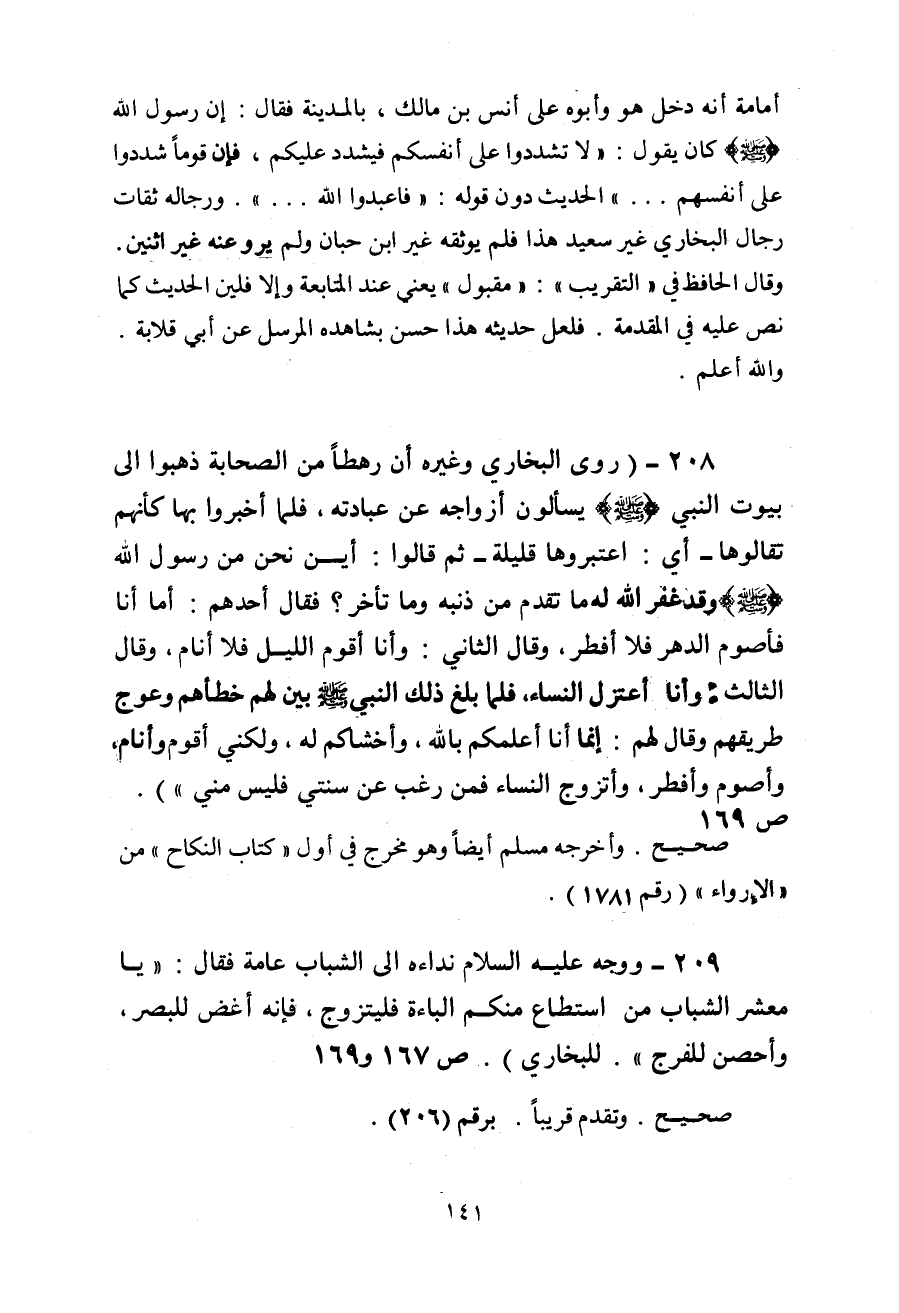 أن رهطا من الصحابة ذهبوا إلى بيوت النبي (ص) يسألون أزواجه عن عبادته فلما أخبروا بها كأنهم تقالوها - أي اعتبروها قليلة - ثم قالوا: أين نحن من رسول الله (ص) وقد غفر له ما تقدم من ذنبه وما تأخر فقال أحدهم: أما أنا فأصوم الدهر فلا أفطر وقال الثاني: وأنا أقوم الليل فلا أنام وقال الثالث: وأنا أعتزل النساء فلما بلغ ذلك النبي (ص) - بين لهم خطأهم وعوج طريقهم - وقال لهم: إنما أنا أعلمكم بالله وأخشاكم له ولكني أقوم وأنام وأصوم وأفطر وأتزوج النساء فمن رغب عن سنتي فليس مني أخرجه البخاري ومسلم