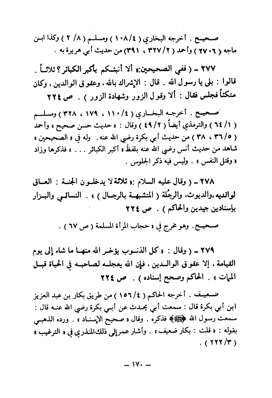 ألا أنبئكم بأكبر الكبائر ثلاثا قالوا: بلى يا رسول الله قال: الإشراك بالله وعقوق الوالدين وكان متكئا فجلس فقال: ألا وقول الزور وشهادة الزور صحيح أخرجه البخاري ومسلم والترمذي وأحمد من حديث أبي بكرة (ر) وله في الصحيحين شاهد من حديث أنس (ر) بلفظ أكبر الكبائر ... فذكرها وزاد وقتل النفس وليس فيه الجلوس