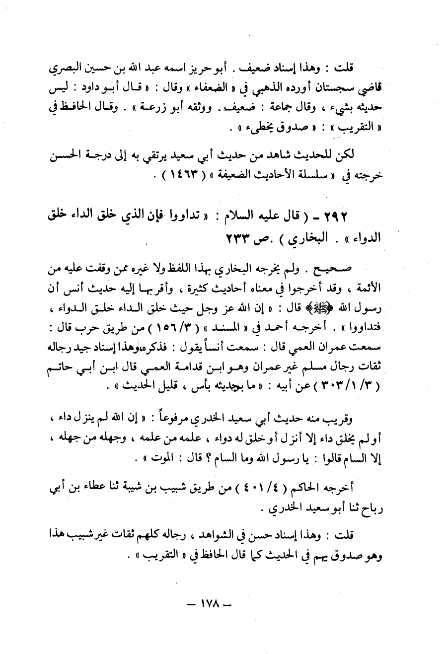 تداووا فإن الذي خلق الداء خلق الدواء البخاري صحيح ولم يخرجه البخاري بهذا اللفظ ولا غيره وقد أخرجوا في معناه أحاديث كثيرة وأقربها إليه حديث أنس أن رسول الله (ص) قال: إن الله D حيث خلق الداء خلق الدواء فتداووا واسناده جيد وقريب منه حديث أبي سعيد الخدري مرفوعا إن الله لم ينزل داء أو لم يخلق داء إلا أنزل أو خلق له دواء علمه من علمه وجهله من جهله إلا السام قالوا: يا رسول الله وما السام قال: الموت واسناده حسن وأما البخاري فقد رواه بلفظ ما أنزل الله داء إلا أنزل له شفاء وأخرجه مسلم والحاكم بلفظ لكل داء دواء فإذا أصيب دواء الداء برأ بإذن الله D وعن أسامة بن شريك مرفوعا بلفظ تداووا فإن الله D لم يضع داء إلا وضع له دواء غير داء واحد: الهرم زاد في رواية علمه من علمه وجهله من جهله أخرجه البخاري في الأدب المفرد وأبو داود والترمذي وابن ماجة وابن حبان والحاكم والطيالسي والحميدي وأحمد والزيادة له في رواية وزاد في أوله وكذا ابن ماجة وأحمد عباد الله وضع الله الحرج إلا امرءا افترض امرءا ظلما فذلك يحرج ويهلك وعن رجل من الأنصار قال: عاد رسول الله (ص) رجلا به جرح فقال رسول الله (ص) : ادعوا له طبيب بني فلان قال: فدعوه فجاء فقال: يا رسول الله ويغني الدواء شيئا فقال: سبحان الله وهل أنزل الله من داء في الأرض إلا جعل له شفاء أخرجه أحمد بسند صحيح