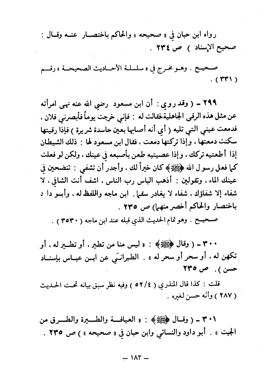 وقد روي أن ابن مسعود (ر) نهى امرأته عن مثل هذه الرقى الجاهلية فقالت له: فإني خرجت يوما فأبصرني فلان فدمعت عيني التي تليه (أي أصابها بعين حاسدة شريرة) فإذا رقيتها سكنت دمعتها وإذا تركتها دمعت فقال ابن مسعود لها: ذلك الشيطان إذا أطعتيه تركك وإذا عصيتيه طعن بأصبعه في عينك ولكن لو فعلت كما فعل رسول الله (ص) كان خيرا لك وأجدر أن تشفى: تنضحين في عينك الماء وتقولين: أذهب الباس رب الناس اشف أنت الشافي لاشفاء إلا شفاؤك شفاء لا يغادر سقما صحيح أخرجه ابن ماجة واللفظ له وأبو داود باختصار والحاكم أخصر منهما وهو تمام الحديث الذي قبله رقم 298