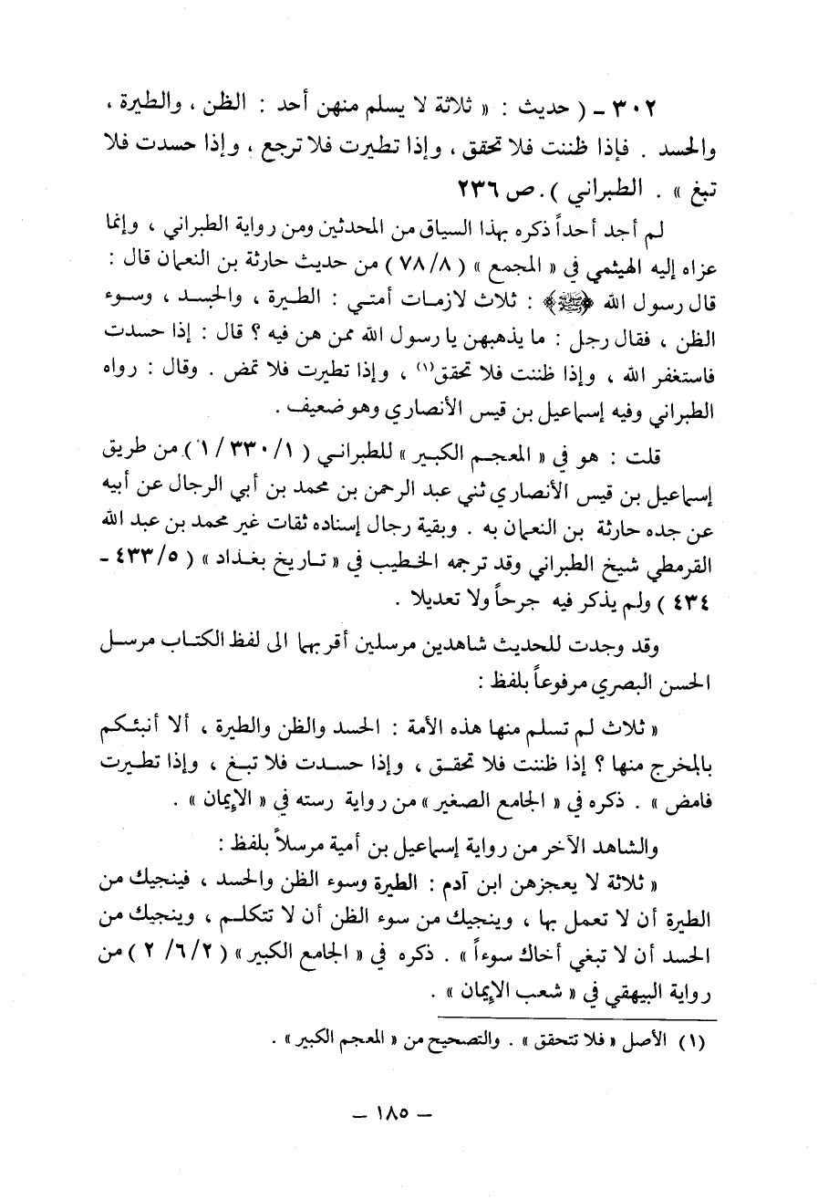 ثلاثة لا يسلم منهن أحد: الظن والطيرة والحسد فإذا ظننت فلا تحقق وإذا تطيرت فلا ترجع وإذا حسدت فلا تبغ الطبراني قال الالباني لم أجد أحدا ذكره بهذا السياق من المحدثين ومن رواية الطبراني وانما عزاه اليه الهيثمي في المجمع من حديث حارثة بن النعمان قال: قال رسول الله (ص) ثلاث لازمات أمتي الطيرة والحسد وسوء الظن فقال رجل ما يذهبهن يا رسول الله ممن هن فيه قال: اذا حسدت فاستغفر الله واذا ظننت فلا تحقق واذا تطيرت فلا تمض وهو ضعيف ... . . الخ