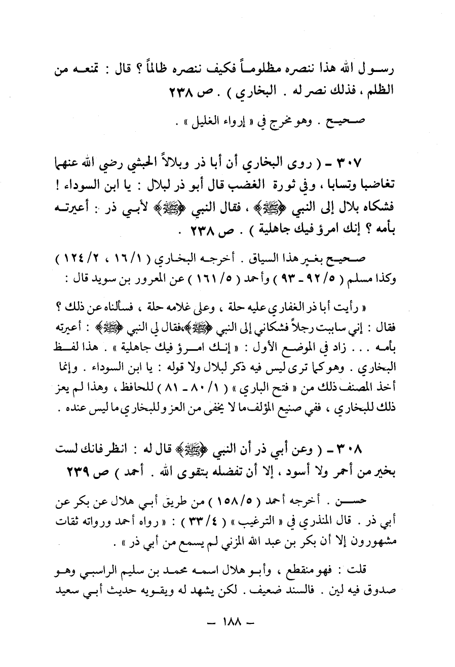 عن أبي ذر أن النبي (ص) قال له: انظر فانك لست بخير من أحمر ولا أسود إلا أن تفضله بتقوى الله أخرجه أحمد وسنده ضعيف ولكن يشهد له ويقويه حديث أبي سعيد قال: قال رسول الله (ص) إن ربكم واحد وإن أباكم واحد فلا فضل لعربي على أعجمي ولا أحمر على أسود إلا بالتقوى فهو حسن