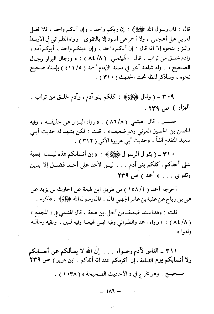 إن أنسابكم هذه ليست بمسبة على أحدكم كلكم بنو آدم ... ليس لأحد على أحد فضل إلا بدين أو تقوى أخرجه أحمد وسنده ضعيف من أجل ابن لهيعة