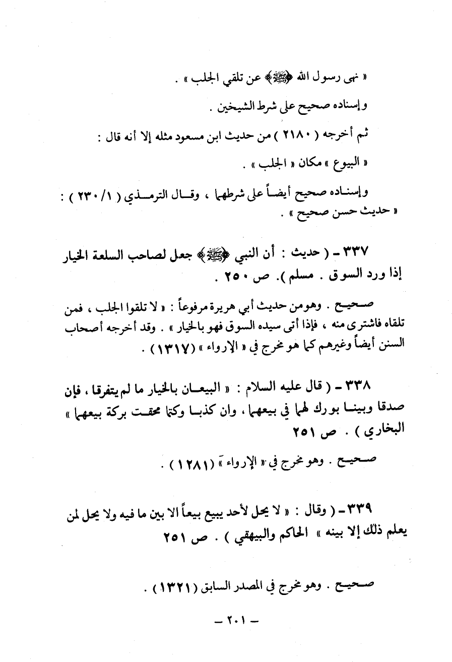 أن النبي (ص) جعل لصاحب السلعة الخيار إذا ورد السوق صحيح رواه مسلم وهو من حديث أبي هريرة مرفوعا لا تلقوا الجلب فمن تلقاه فاشترى منه فإذا اتى سيده السوق فهو بالخيار وقد أخرجه أصحاب السنن أيضا وغيرهم وهو في الإرواء