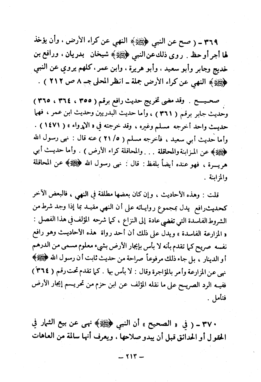 صح عن النبي (ص) النهي عن كراء الأرض وأن يؤخذ لها أجر أو حظ روى ذلك عن النبي (ص) شيخان بدريان ورافع بن خديج وجابر وأبو سعيد وأبو هريرة وابن عمر كلهم يروي عن النبي (ص) النهي عن كراء الأرض جملة صحيح انظر الشرح وخلاصته هذه الأحاديث وإن كان بعضها مطلقة في النهي فالبعض الآخر كحديث رافع يدل بنجموع رواياته على أن النهي مقيد بما إذا وجد شرط من الشروط الفاسدة التي تفضي إلى النزاع وقد جاء صراحة من حديث ثابت أن رسول الله (ص) نهى عن المزارعة وأمر بالمؤاجرة وقال لابأس بها كما تقدم تحت رقم 364