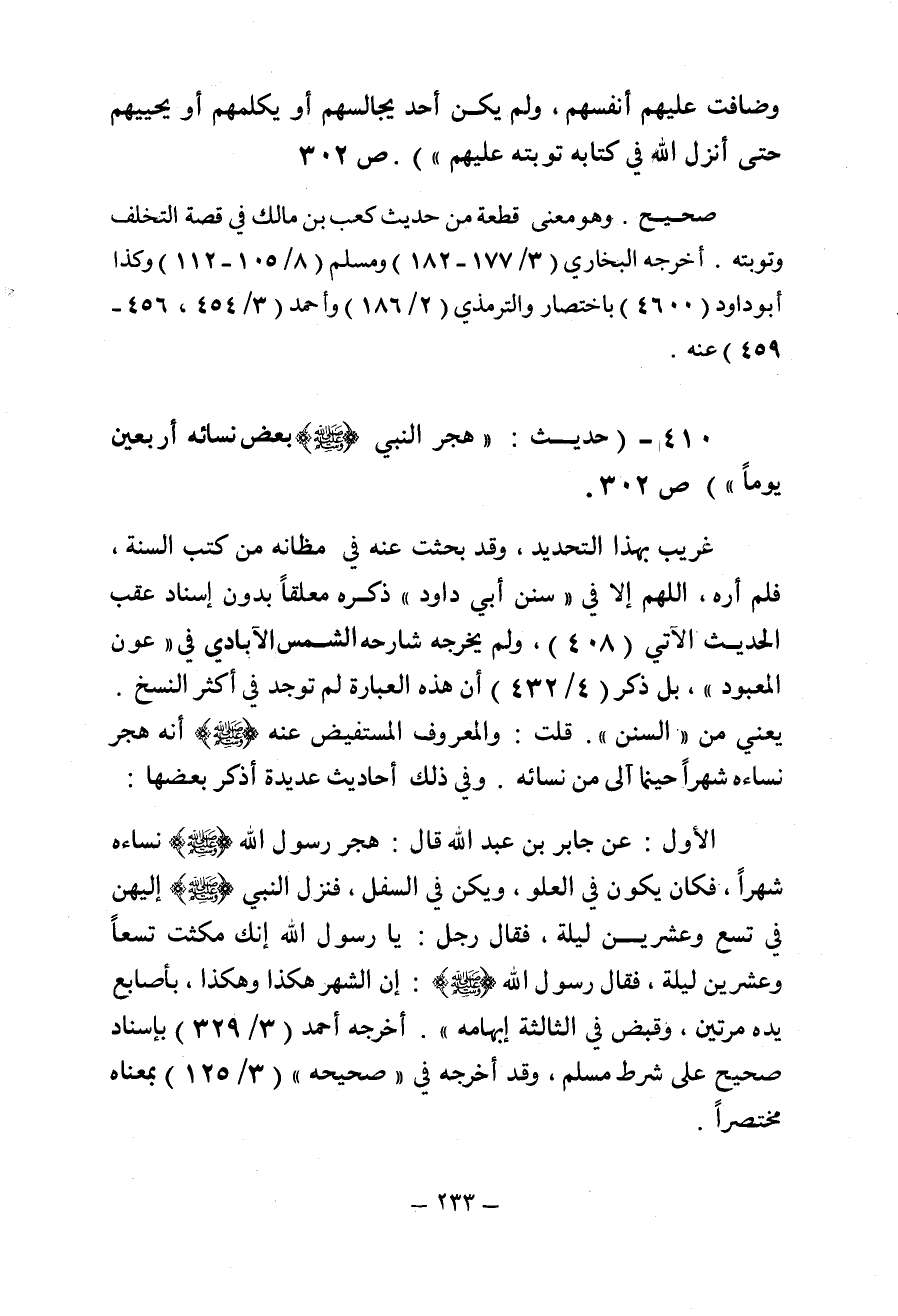 عن جابر بن عبد الله قال: هجر رسول الله (ص) نساءه شهرا فكان يكون في العلو ويكن في السفل فنزل النبي (ص) إليهن في تسع وعشرين ليلة فقال رجل: يا رسول الله إنك مكثت تسعا وعشرين ليلة فقال رسول الله (ص) إن الشهر هكذا وهكذا بأصابع يده مرتين وقبض في الثالثة إبهامه أخرجه أحمد بإسناد صحيح على شرط مسلم وقد أخرجه في صحيحه بمعناه مختصرا وعن ابن عباس قال: هجر رسول الله (ص) نساءه شهرا فلما مضى تسع وعشرون أتاه جبريل فقال قد برت يمينك وقد تم الشهر واسناده صحيح على شرط مسلم وهو عند أحمد