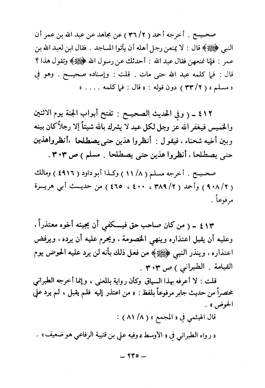 تفتح أبواب الجنة يوم الإثنين والخميس فيغفر الله D لكل عبد لا يشرك بالله شيئا إلا رجلا كان بينه وبين أخيه شحناء فيقول: أنظروا هذين حتى يصطلحا أنظروا هذين حتى يصطلحا أنظروا هذين حتى يصطلحا صحيح أخرجه مسلم وأبو داود ومالك وأحمد