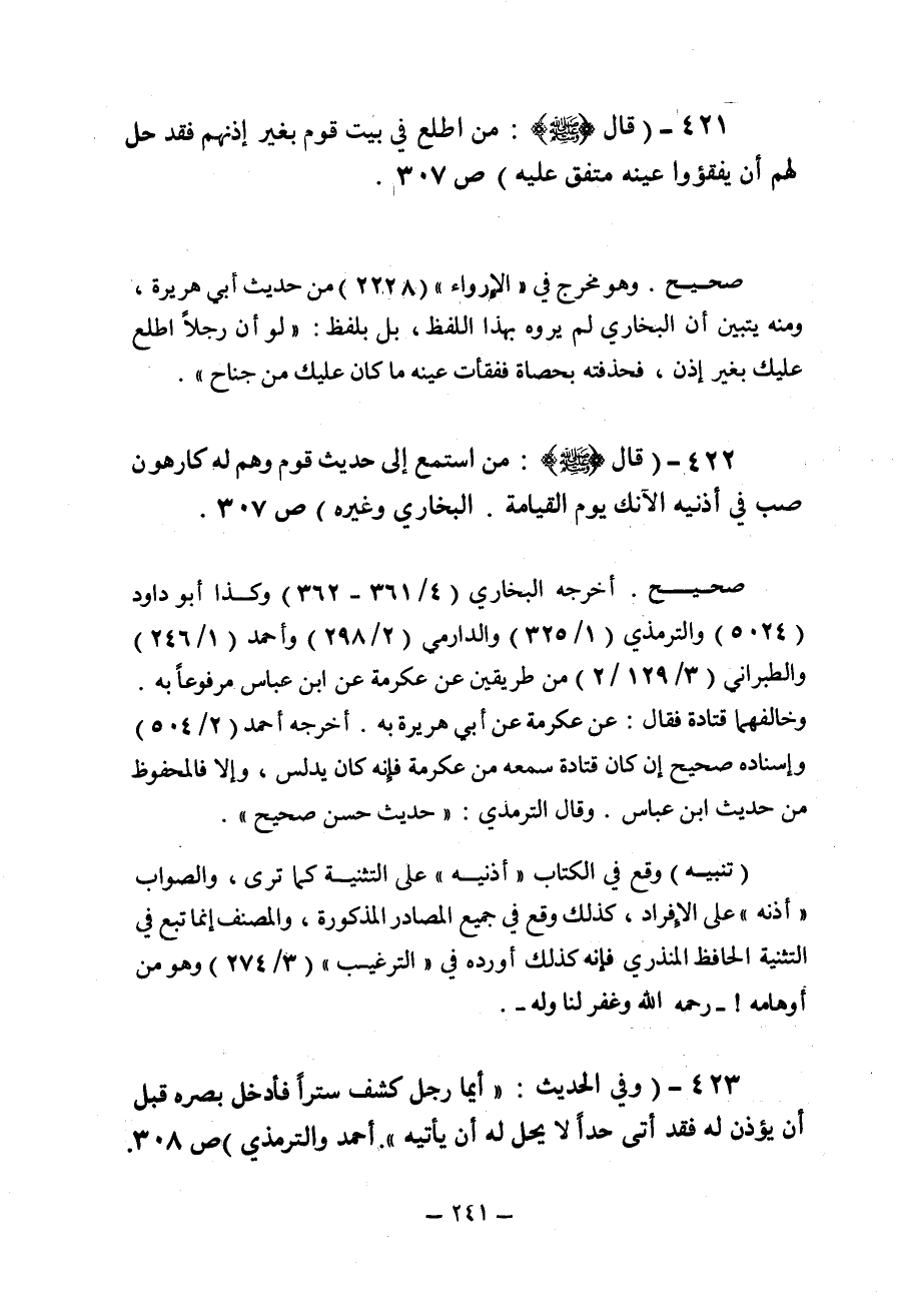 من استمع إلى حديث قوم وهم له كارهون صب في أذنيه الآنك يوم القيامة صحيح أخرجه البخاري وأبو داود والترمذي والدارمي وأحمد والطبراني والصواب أذنه على الإفراد