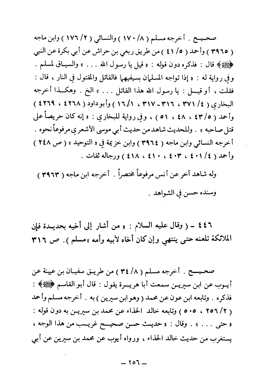 من أشار إلى أخيه بحديدة فإن الملائكة تلعنه حتى ينتهي وإن كان أخاه لأبيه وأمه صحيح أخرجه مسلم وللحديث شاهد من حديث عائشة (ر) مرفوعا بلفظ من أشار بحديدة إلى أحد من المسلمين يريد قتله فقد وجب دمه أخرجه أحمد من طريق علقمة عن أمه في قصة ذكرها فقالت عائشة به وهذا اسناد رجاله ثقات غير أم علقمة ففيها جهالة