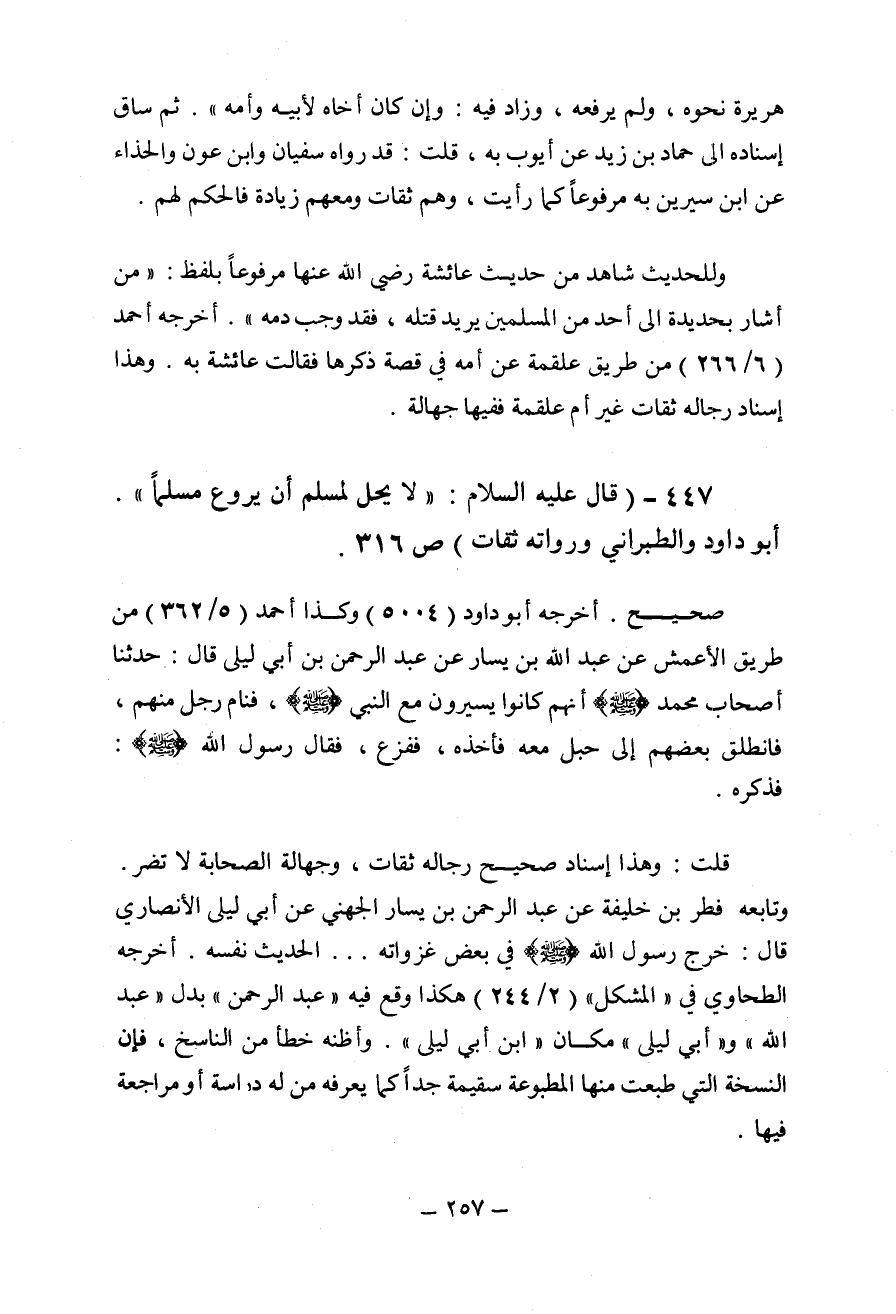 لا يحل لمسلم أن يروع مسلما صحيح أخرجه أبو داود وأحمد من طريق الأعمش عن عبد الله بن يسار عن عبد الرحمن بن أبي ليلى قال: حدثنا أصحاب محمد (ص) أنهم كانوا يسيرون مع النبي (ص) فنام رجل منهم فانطلق رجل منهم إلى حبل معه فأخذه ففزع فقال رسول الله (ص) : فذكره وهذا اسناده صحيح قوله حبل بالحاء هكذا وقع في الترغيب وكذلك هو في سنن أبي داود ووقع في المسند نبل بالنون وهو الصواب