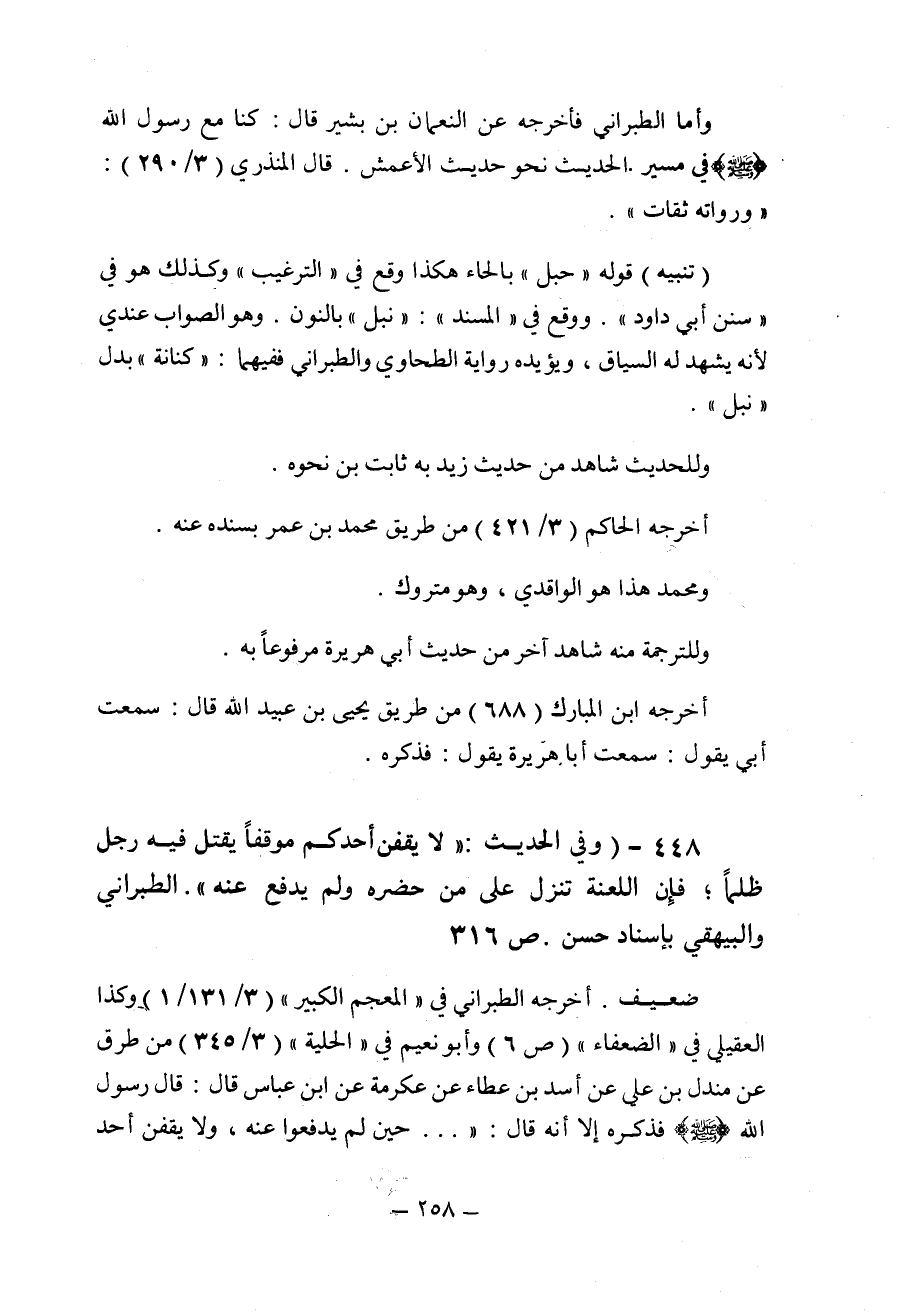 لا يقفن أحدكم موقفا يقتل فيه رجل ظلما فإن اللعنة تنزل على من حضره ولم يدفع عنه ضعيف أخرجه الطبراني في المعجم الكبير وكذا العقيلي في الضعفاء وأبو نعيم في الحلية وأخرج الطبراني أيضا باسناد واه عن ابن عباس قال: قال رسول الله (ص) : قال ربكم وعزتي وجلالي لأنتقمن من الظالم في عاجله وآجله ولأنتقمن ممن رأى مظلوما فقدر أن ينصره فلم يفعل