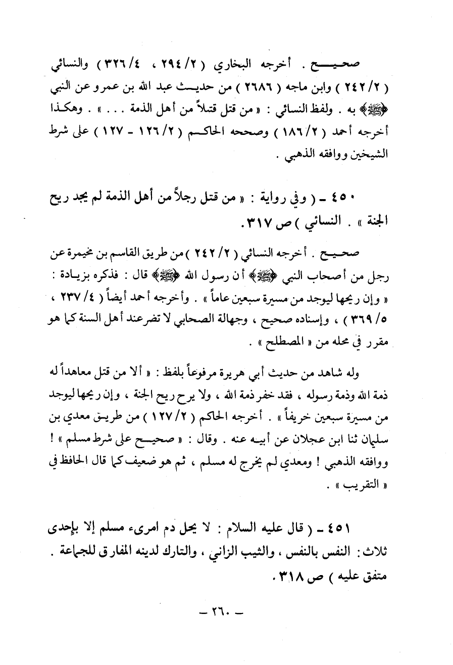 من قتل رجلا من أهل الذمة لم يجد ريح الجنة صحيح أخرجه النسائي وله شاهد من حديث أبي هريرة مرفوعا بلفظ ألا من قتل معاهدا له ذمة الله وذمة رسوله فقد خفر ذمة الله ولا يرح ريح الجنة وإن ريحها ليوجد من مسيرة سبعين خريفا أخرجه الحاكم من طريق معدي بن سليمان وهو ضعيف