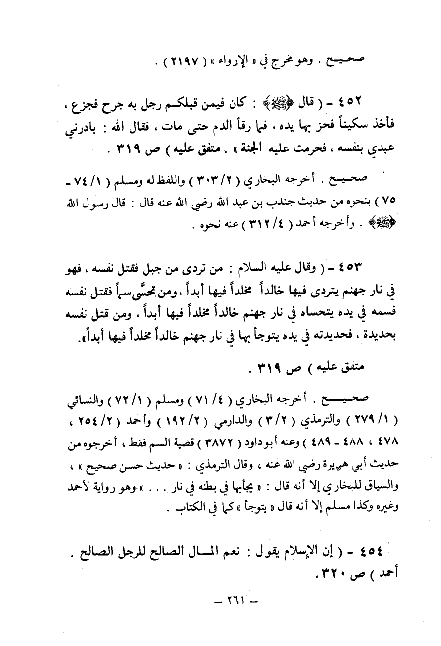كان فيمن قبلكم رجل به جرح فجزع فأخذ سكينا فحز بها يده فما رقا الدم حتى مات فقال الله: بادرني عبدي بنفسه فحرمت عليه الجنة صحيح أخرجه البخاري واللفظ له ومسلم بنحوه
