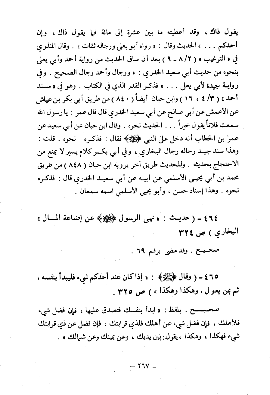 ابدأ بنفسك فتصدق عليها فإن فضل شيء فلأهلك فإن فضل شيء عن أهلك فلذي قرابتك فإن فضل عن ذي قرابتك شيء فهكذا وهكذا يقول: بين يديك وعن يمينك وعن شمالك صحيح أخرجه مسلم وأبو داود والنسائي وغيرهم وهو في الارواء