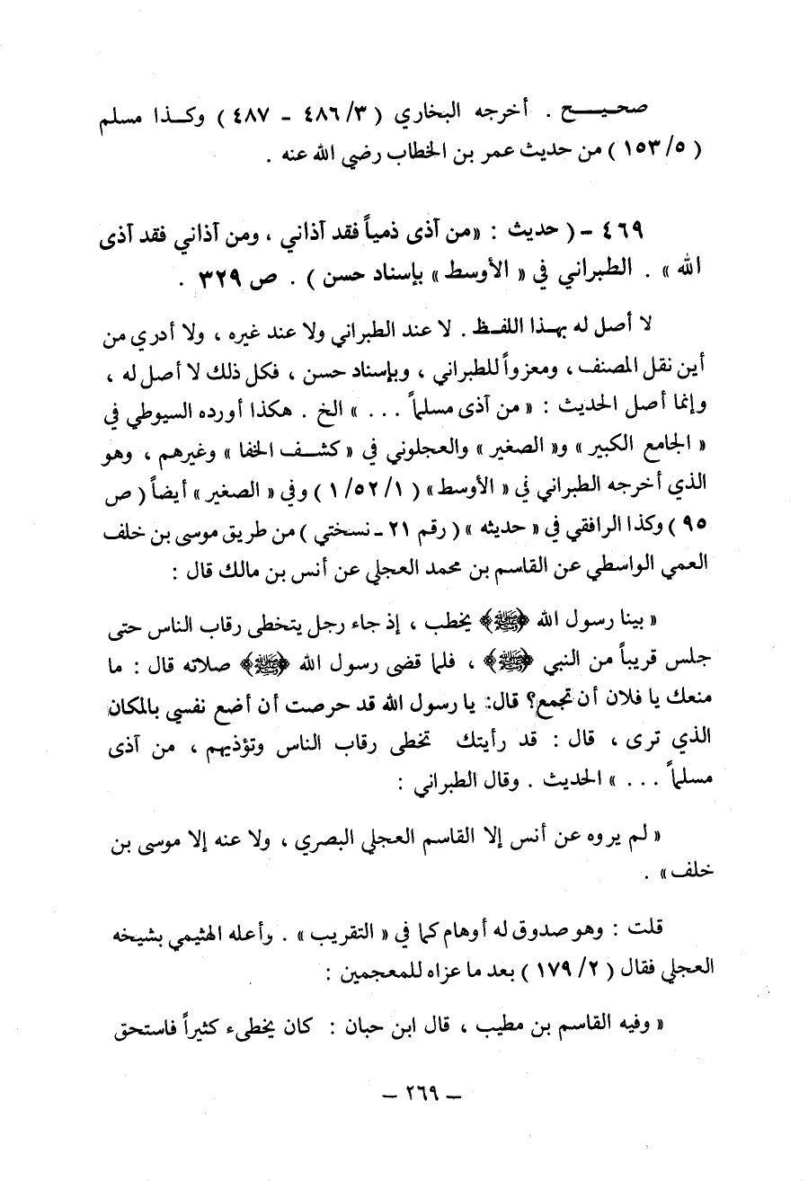 من آذى ذميا فقد آذاني ومن آذاني فقد آذى الله الطبراني في الأوسط لا أصل له بهذا اللفظ لاعند الطبراني ولا عند غيره وإنما اصل الحديث من آذى مسلما فقد ورد عن أنس بن مالك قال: بينا رسول الله (ص) يخطب إذ جاء رجل يتخطى رقاب الناس حتى جلس قريبا من النبي (ص) فلما قضى رسول الله (ص) صلاته قال: ما منعك يا فلان أن تجمع قال: يا رسول الله قد حرصت أن أضع نفسي بالمكان الذي ترى قال قد رأيتك تخطى رقاب الناس تؤذيهم من آذى مسلما فقد ... . . الحديث لم يروه عن أنس إلا القاسم العجلي البصري ولا عنه إلا موسى بن خلف وهو صدوق له أوهام وفي القاسم بن مطيب كان يخطىء كثيرا فاستحق الترك وأورده الذهبي في الضعفاء
