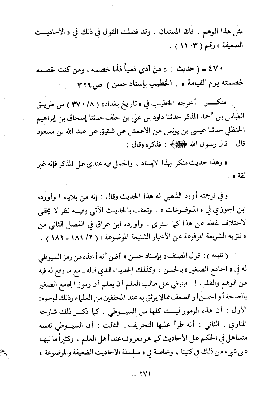 من آذى ذميا فأنا خصمه ومن كنت خصمه خصمته يوم القيامة منكر أخرجه الخطيب في تاريخ بغداد