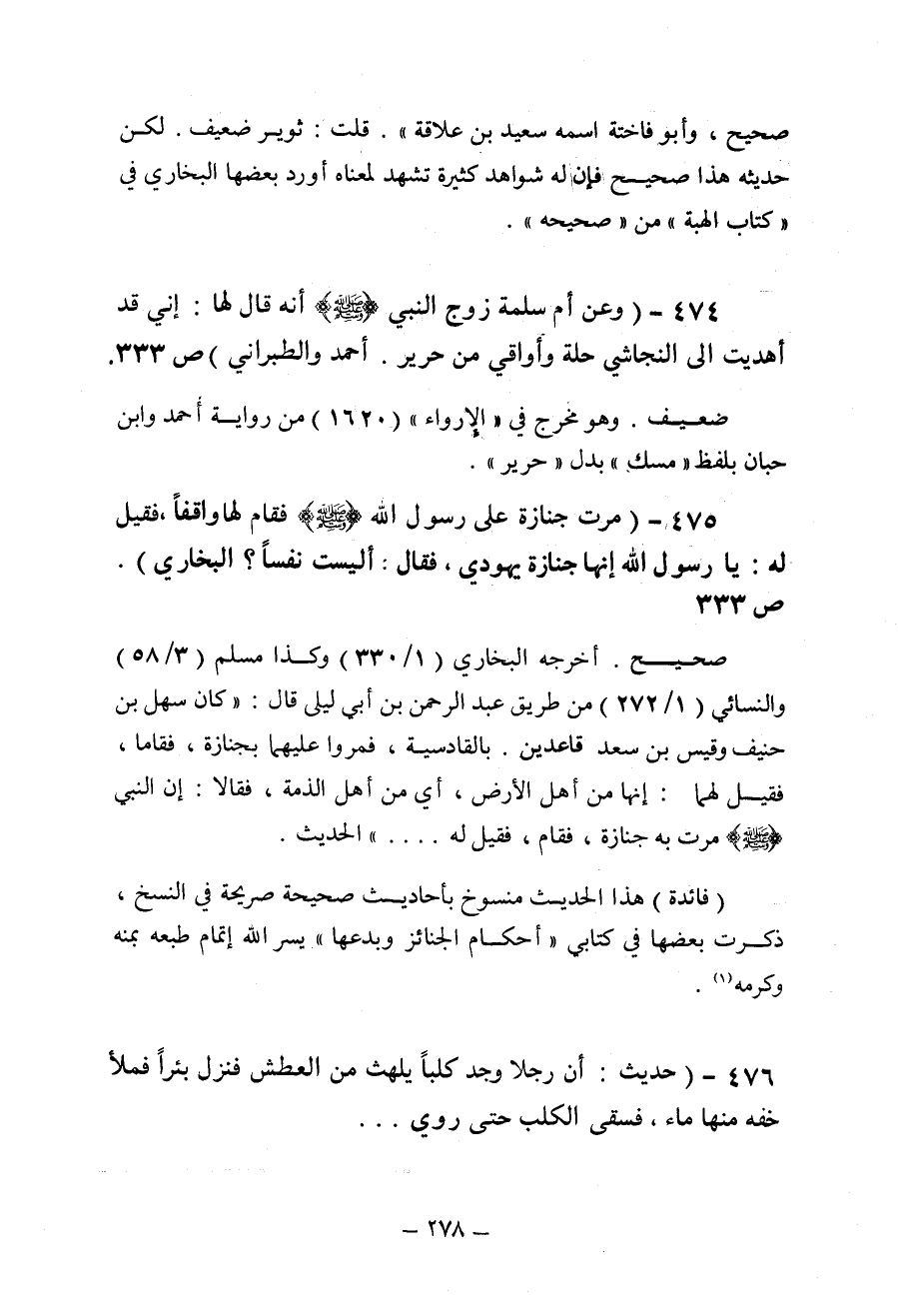 مرت جنازة على رسول الله (ص) فقام لها واقفا فقيل له: يا رسول الله إنها جنازة يهودي فقال أليست نفسا صحيح أخرجه البخاري وكذا مسلم والنسائي (فائدة) هذا الحديث منسوخ بأحاديث صحيحة صريحة في النسخ ذكرت بعضها في كتابي أحكام الجنائز وبدعها