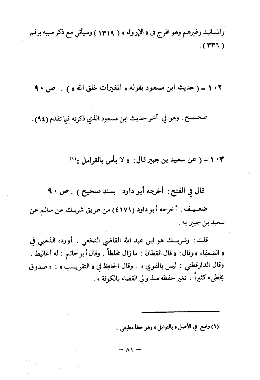 عن سعيد بن جبير قال: لا بأس بالقرامل أخرجه أبو داود وهذا الأثر مع ضعف سنده يخالف حديث معاوية المتقدم رقم 100 فإن في بعض الروايات الصحيحة عنه أن رجلا جاء بعصا على رأسها خرقة فقال معاوية ألا وهذا الزور قال قتادة يعني ما يكثر به النساء أشعارهن من الخرق أخرجه مسلم وأحمد