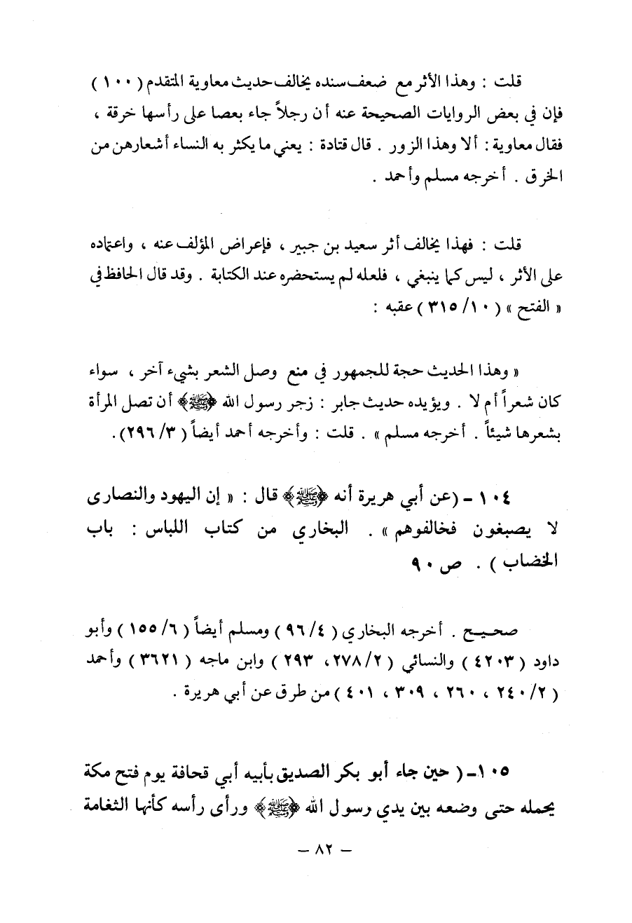 حين جاء أبو بكر الصديق بأبيه ابي قحافة يوم فتح مكة يحمله حتى وضعه بين يدي رسول الله (ص) ورأى رأسه كأنه الثغامة بياضا قال: غيروا هذا (أي الشيب) وجنبوه السواد أخرجه مسلم وأبو داود والنسائي وابن ماجة وأحمد