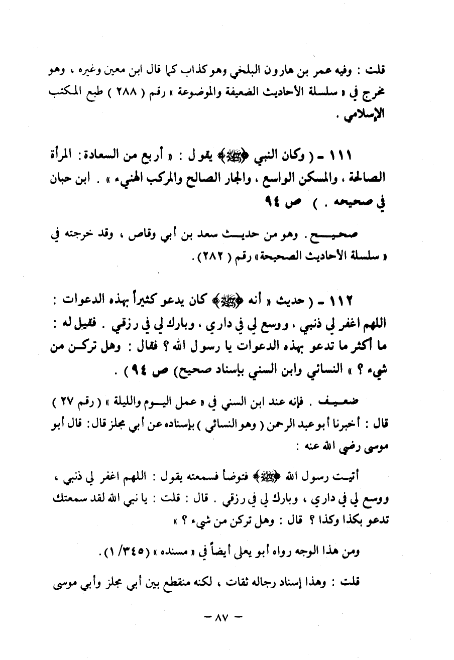 أخبرنا النسائي باسناده عن أبي مجلز قال: قال أبو موسى (ر) : أتيت رسول الله (ص) فتوضأ فسمعته يقول: اللهم اغفر لي ذنبي ووسع لي في داري وبارك لي في رزقي قال: قلت: يانبي الله لقد سمعتك تدعو بكذا وكذا قال وهل ترمن من شيء