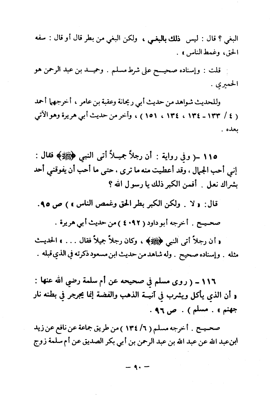 قال رسول الله (ص) لا يدخل الجنة من كان في قلبه مثقال ذرة من كبر فقال رجل: إن الرجل يحب أن يكون ثوبه حسنا ونعله حسنة فقال (ص) إن الله جميل يحب الجمال أخرجه مسلم من حديث علقمة وزاد في آخره الكبر بطر الحق وغمط الناس وأخرجه أحمد من طريق حميد بن عبد الرحمن قال قال ابن مسعود ... . . فأتيته (ص) وعنده مالك بن مرارة الرهاوي فأدركت من آخر حديثه وهو يقول يا رسول الله قد قسم لي من الجمال ما ترى فما أحب أن أحدا من الناس فضلني بشراكين فما فوقهما أفليس ذلك هو البغي قال ليس ذلك بالبغي ولكن البغي من بطر قال أو قال: سفه الحق وغمط الناس
