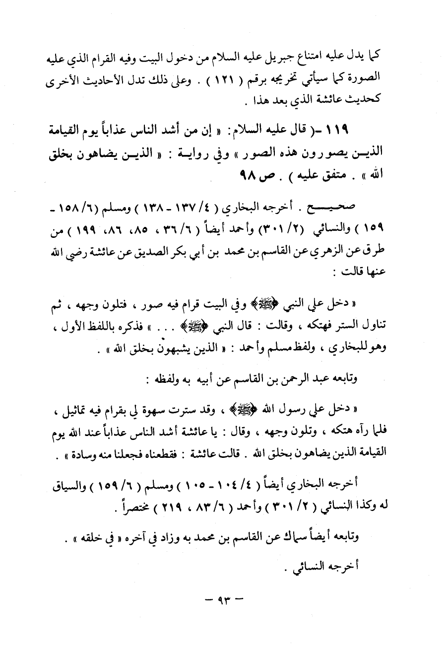 قال عليه السلام: إن من أشد الناس عذابا يوم القيامة الذين يصورون هذه الصور وفي رواية الذين يضاهون بخلق الله متفق عليه أخرجه البخاري ومسلم والنسائي وأحمد من طرق عن الزهري عن القاسم بن محمد بن أبي بكر الصديق عن عائشة (ر) قالت: دخل علي النبي (ص) وفي البيت قرام فيه صور فتلون وجهه ثم تناول الستر فهتكه وقالت: قال النبي (ص) فذكره باللفظ الأول وهو للبخاري ولفظ مسلم وأحمد الذين يشبهون بخلق الله (أنظر تتمة الشرح وانصوص الأخرى ص 93 من الكتاب)
