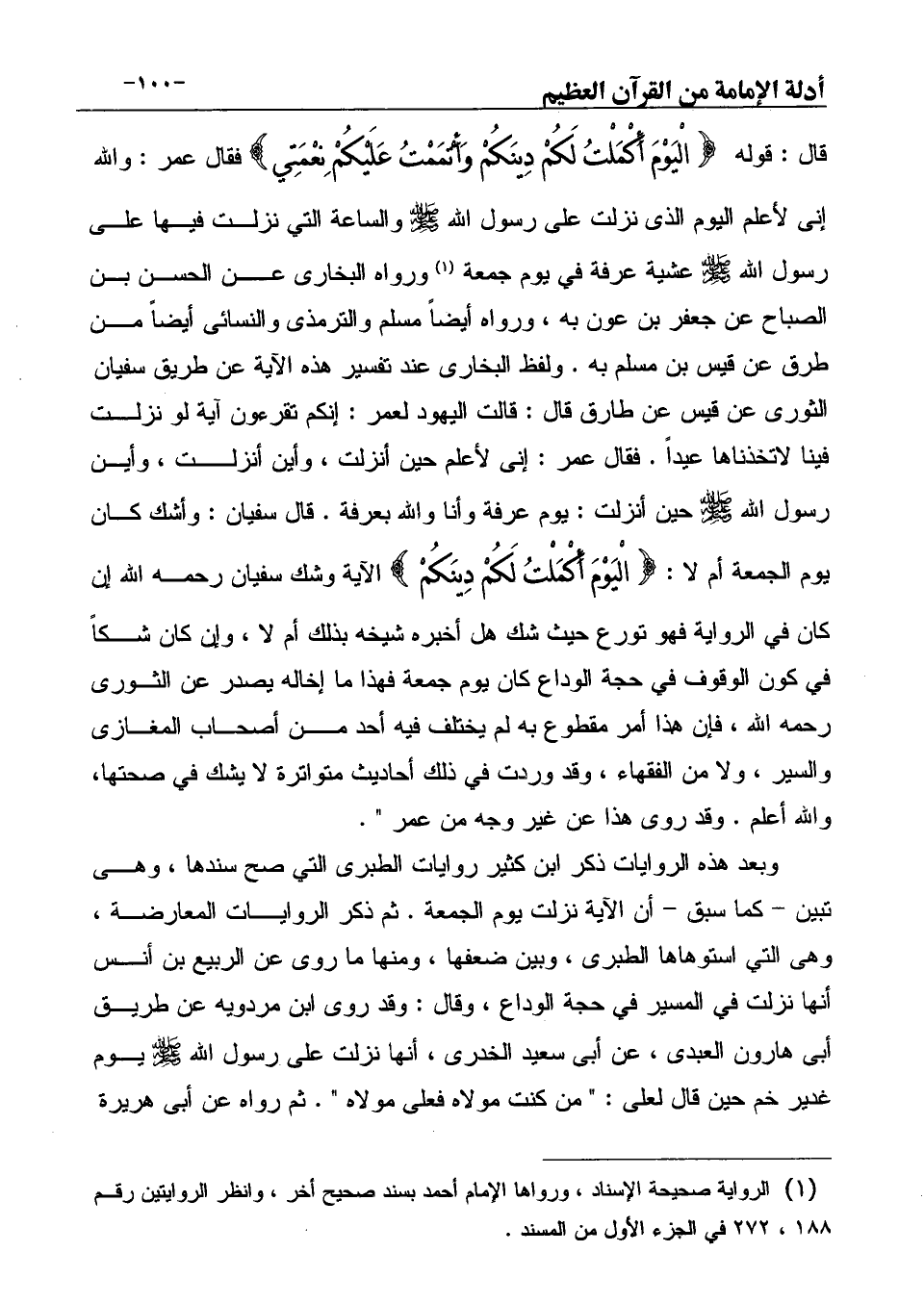 قال: قوله " الْيَوْمَ أَكْمَلْتُ لَكُمْ دِينَكُمْ وَأَتْمَمْتُ عَلَيْكُمْ نِعْمَتِي " فقال عمر: والله إنى لأعلم اليوم الذي نزلت على رسول الله صَلَّى اللهُ عَلَيْهِ وَسَلَّمَ والساعة التي نزلت فيها على رسول الله صَلَّى اللهُ عَلَيْهِ وَسَلَّمَ عشية عرفة في يوم جمعة (¬1) ورواه البخاري عن الحسن بن الصباح عن جعفر بن عون به، ورواه أيضاً مسلم والترمذى والنسائى أيضاً من طرق عن قيس بن مسلم به. ولفظ البخاري عند تفسير هذه الآية عن طريق سفيان الثوري عن قيس عن طارق قال: قالت اليهود لعمر: إنكم تقرءون آية لو نزلت فينا لاتخذناها عيداً. فقال عمر: إنى لأعلم حين أنزلت، وأين أنزلت، وأين رسول الله صَلَّى اللهُ عَلَيْهِ وَسَلَّمَ حين أنزلت: يوم عرفة وأنا والله بعرفة. قال سفيان: وأشك كان يوم الجمعة أم لا: " الْيَوْمَ أَكْمَلْتُ لَكُمْ دِينَكُمْ " الآية وشك سفيان رحمه الله إن كان في الرواية فهو تورع حيث شك هل أخبره شيخه بذلك أم لا، وإن كان شكاً في كون الوقوف في حجة الوداع كان يوم جمعة فهذا ما إخاله يصدر عن الثوري رحمه الله، فإن هذا أمر مقطوع به لم يختلف فيه أحد من أصحاب المغازي والسير، ولا من الفقهاء، وقد وردت في ذلك أحاديث متواترة لا يشك في صحتها، والله أعلم. وقد روى هذا عن غير وجه من عمر ".