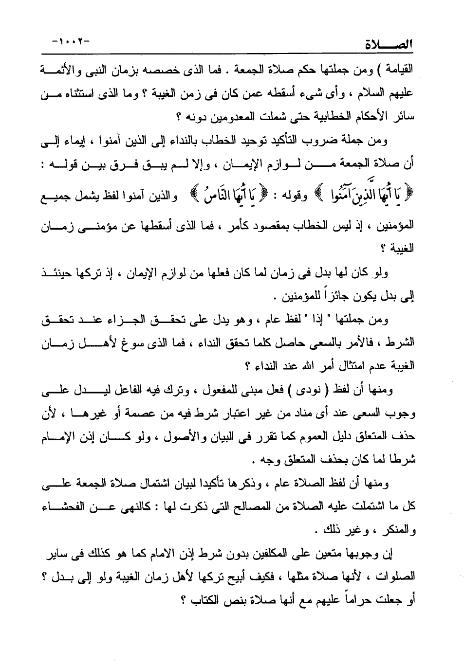 القيامة) ومن جملتها حكم صلاة الجمعة. فما الذى خصصه بزمان النبى والأئمة عليهم السلام، وأي شيىء أسقطه عمن كان فى زمن الغيبة؟ وما الذى استثناه من سائر الأحكام الخطابية حتى شملت المعدومين دونه؟