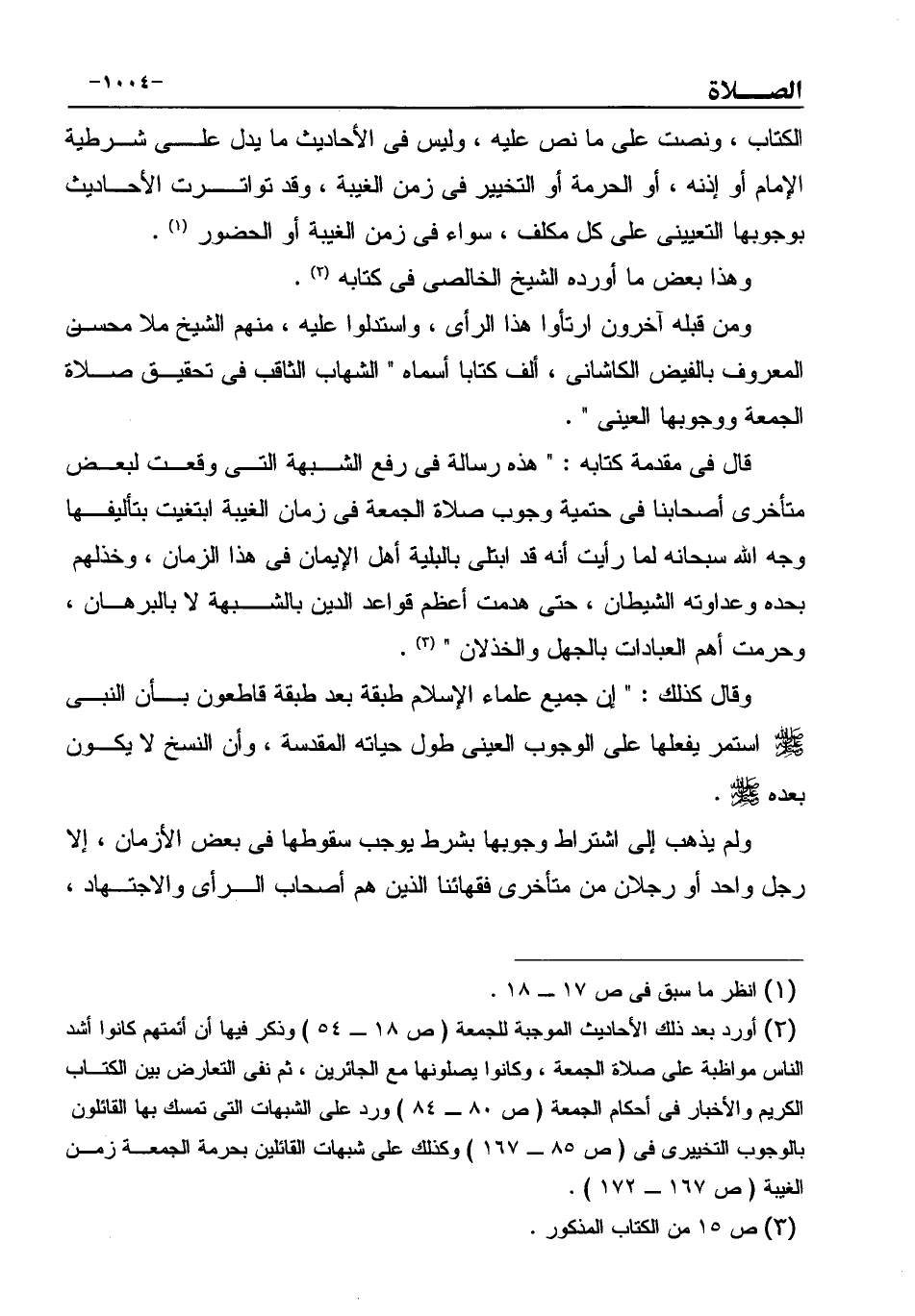 (¬2) أورد بعد ذلك الأحاديث الموجبة للجمعة (ص 18 ـ 54) وذكر فيها أن أئمتهم كانوا أشد الناس مواظبة على صلاة الجمعة، وكانوا يصلونها مع الجائرين، ثم نفى التعارض بين الكتاب الكريم والأخبار فى أحكام الجمعة (ص 80 ـ 84) ورد على الشبهات التى تمسك بها القائلون بالوجوب التخييرى فى (ص 85 ـ 167) وكذلك على شبهات القائلين بحرمة الجمعة زمن الغيبة (ص 167 ـ 172) .