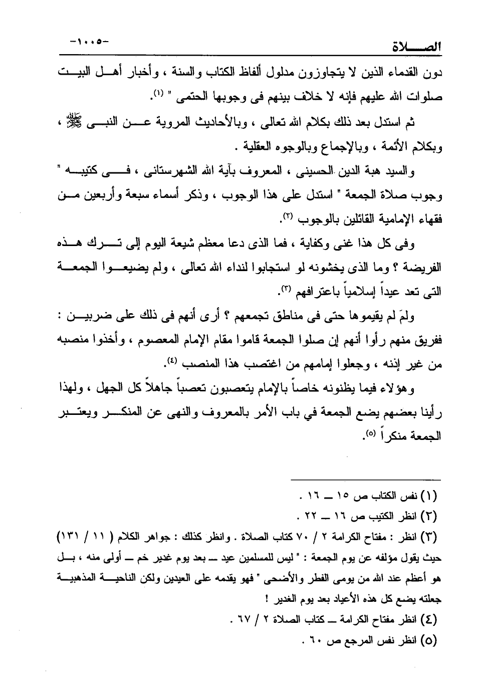 (¬3) انظر: مفتاح الكرامة 2 / 70 كتاب الصلاة. وانظر كذلك: جواهر الكلام (11 / 131) حيث يقول مؤلفه عن يوم الجمعة: " ليس للمسلمين عيد ـ بعد يوم غدير خم ـ أولى منه، بل هو أعظم عند الله من يومى الفطر والأضحى " فهو يقدمه على العيدين ولكن الناحية المذهبية جعلته يضع كل هذه الأعياد بعد يوم الغدير!