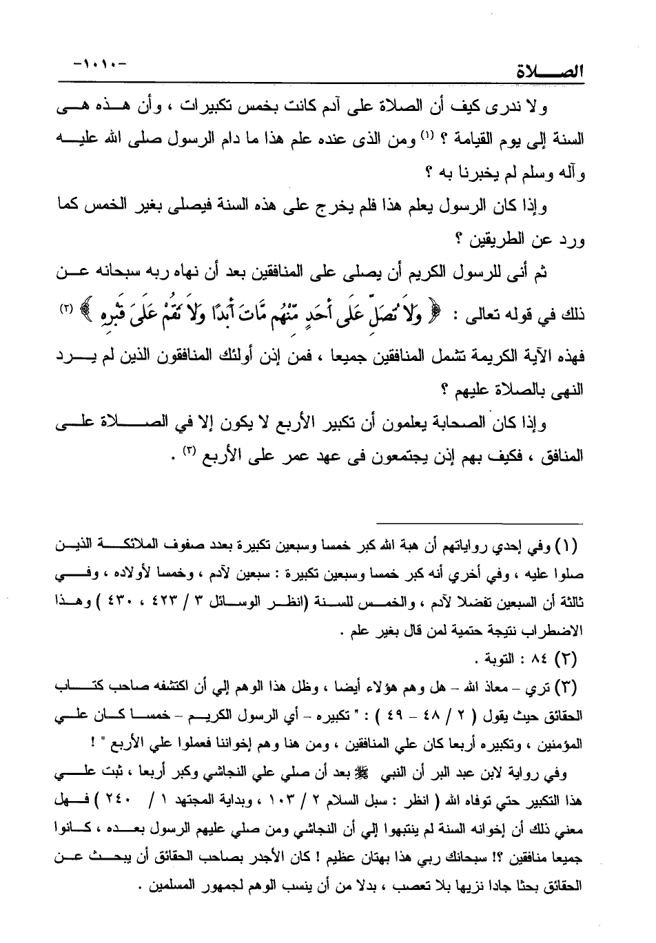 (¬3) تري - معاذ الله - هل وهم هؤلاء أيضا، وظل هذا الوهم إلي أن اكتشفه صاحب كتاب الحقائق حيث يقول (2 / 48 - 49) : " تكبيره - أي الرسول الكريم - خمسا كان علي المؤمنين، وتكبيره أربعا كان علي المنافقين، ومن هنا وهم إخواننا فعملوا علي الأربع "!