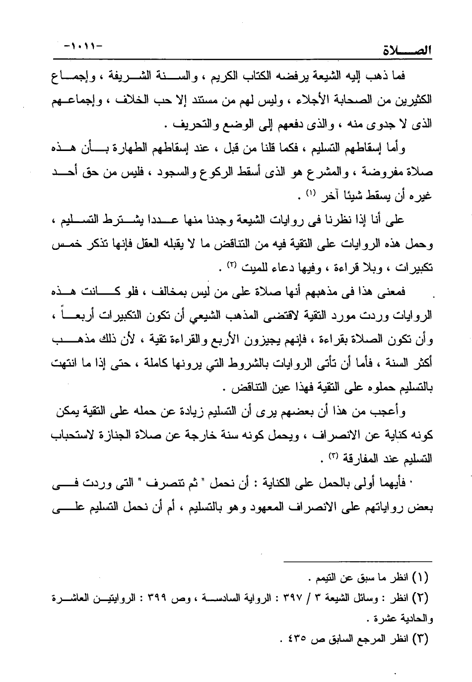 وأعجب من هذا أن بعضهم يرى أن التسليم زيادة عن حمله على التقية يمكن كونه كناية عن الانصراف، ويحمل كونه سنة خارجة عن صلاة الجنازة لاستحباب التسليم عند المفارقة (¬3) .