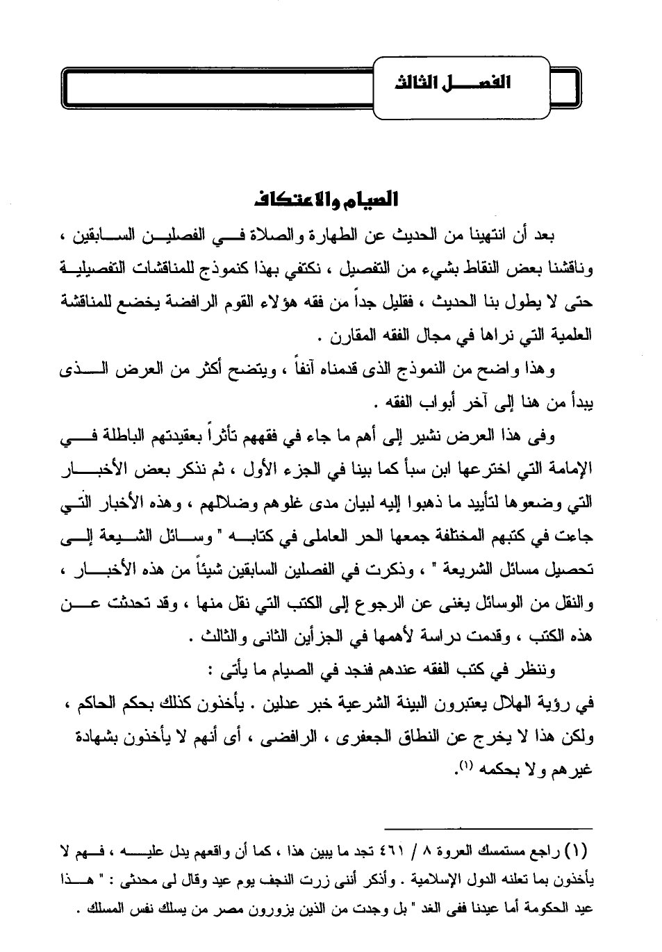 (¬1) راجع مستمسك العروة 8 / 461 تجد ما يبين هذا، كما أن واقعهم يدل عليه، فهم لا يأخذون بما تعلنه الدول الإسلامية. وأذكر أننى زرت النجف يوم عيد وقال لى محدثى: " هذا عيد الحكومة أما عيدنا ففى الغد " بل وجدت من الذين يزورون مصر من يسلك نفس المسلك.