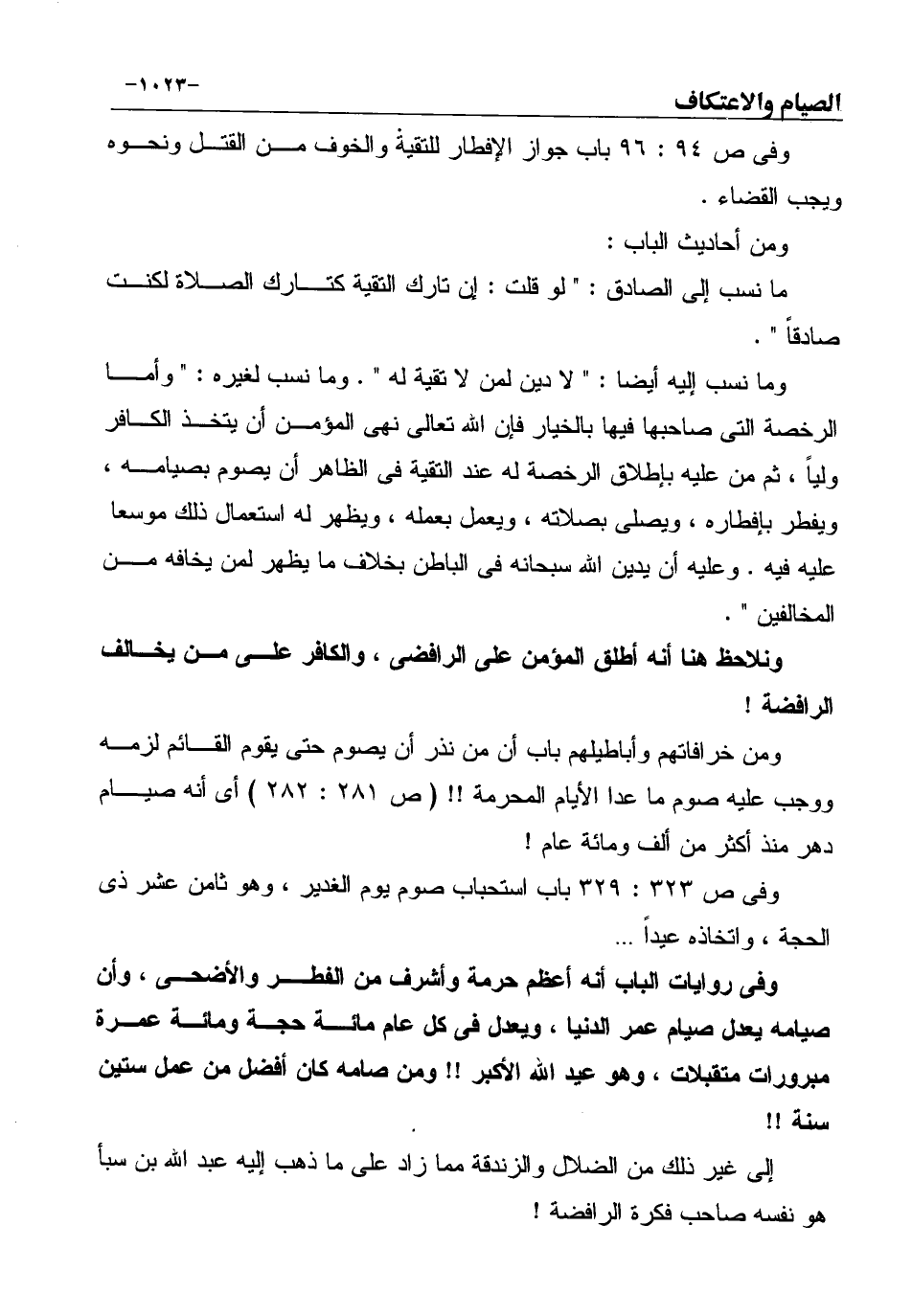 ومن خرافاتهم وأباطيلهم باب أن من نذر أن يصوم حتى يقوم القائم لزمه ووجب عليه صوم ما عدا الأيام المحرمة!! (ص 281: 282) أي أنه صيام دهر منذ أكثر من ألف ومائة عام!
