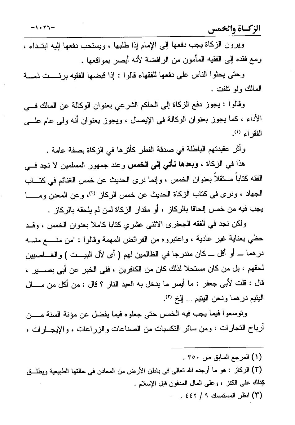 هذا في الزكاة، وبعدها نأتي إلى الخمس وعند جمهور المسلمين لا نجد في الفقه كتاباً مستقلاً بعنوان الخمس، وإنما نرى الحديث عن خمس الغنائم في كتاب الجهاد، ونرى فى كتاب الزكاة الحديث عن خمس الركاز (¬2) ، وعن المعدن وما يجب فيه من خمس إلحاقا بالركاز، أو مقدار الزكاة لمن لم يلحقه بالركاز.