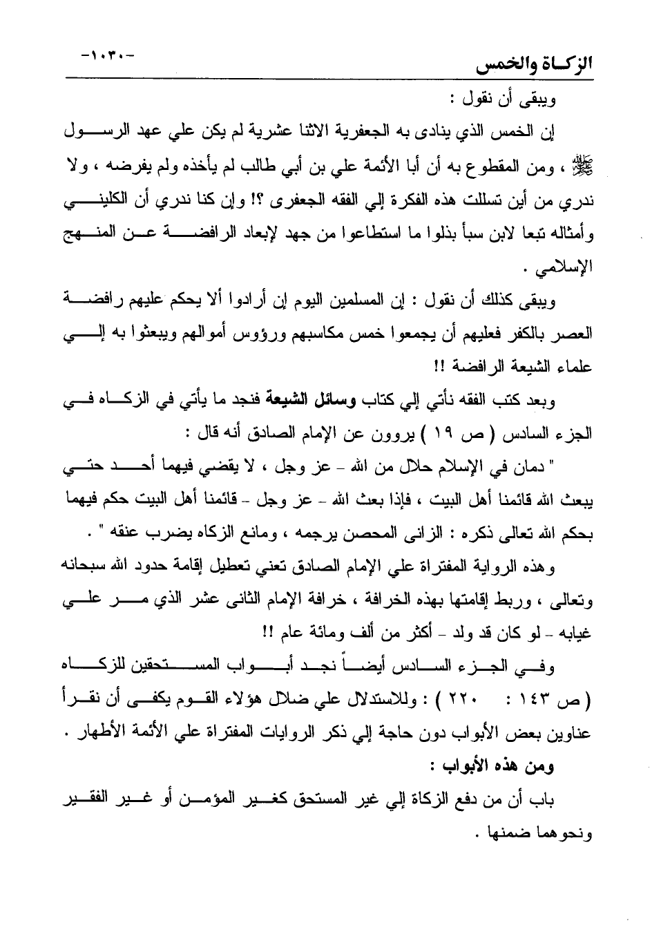 وفي الجزء السادس أيضاً نجد أبواب المستحقين للزكاه (ص 143: ... 220) : وللاستدلال علي ضلال هؤلاء القوم يكفى أن نقرأ عناوين بعض الأبواب دون حاجة إلي ذكر الروايات المفتراة علي الأئمة الأطهار.