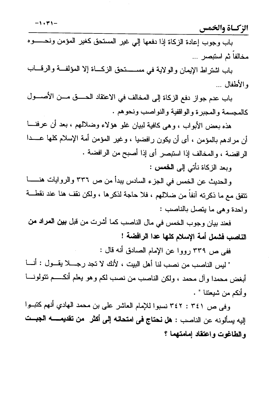 وفى ص 341: 342 نسبوا للإمام العاشر على بن محمد الهادي أنهم كتبوا إليه يسألونه عن الناصب: هل نحتاج فى امتحانه إلى أكثر من تقديمه الجبت والطاغوت واعتقاد إمامتهما؟