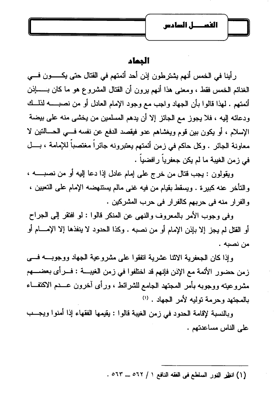 وإذا كان الجعفرية الاثنا عشرية اتفقوا على مشروعية الجهاد ووجوبه فى زمن حضور الأئمة مع الإذن فإنهم قد اختلفوا في زمن الغيبة: فرأي بعضهم مشروعيته ووجوبه بأمر المجتهد الجامع للشرائط، ورأي آخرون عدم الاكتفاء بالمجتهد وحرمة توليه لأمر الجهاد. (¬1)