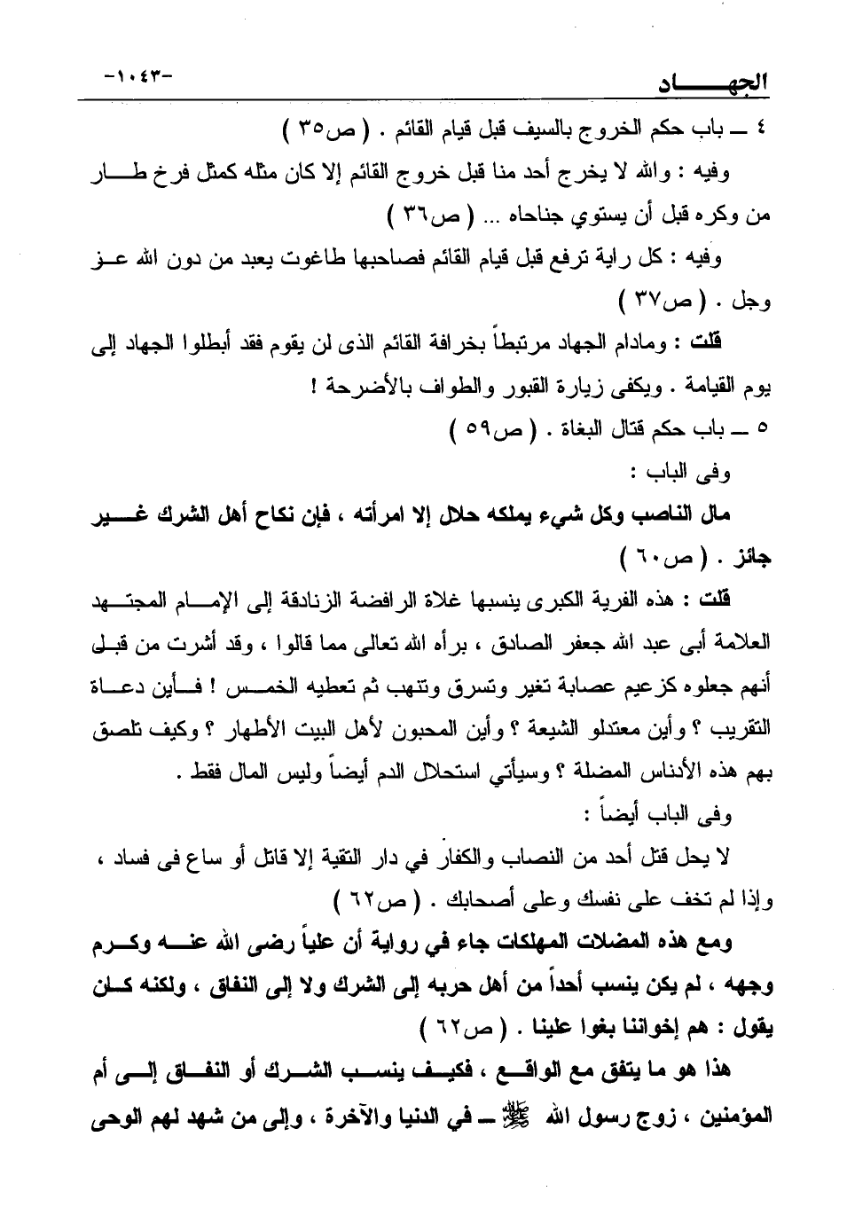 قلت: ومادام الجهاد مرتبطاً بخرافة القائم الذى لن يقوم فقد أبطلوا الجهاد إلى يوم القيامة. ويكفى زيارة القبور والطواف بالأضرحة!