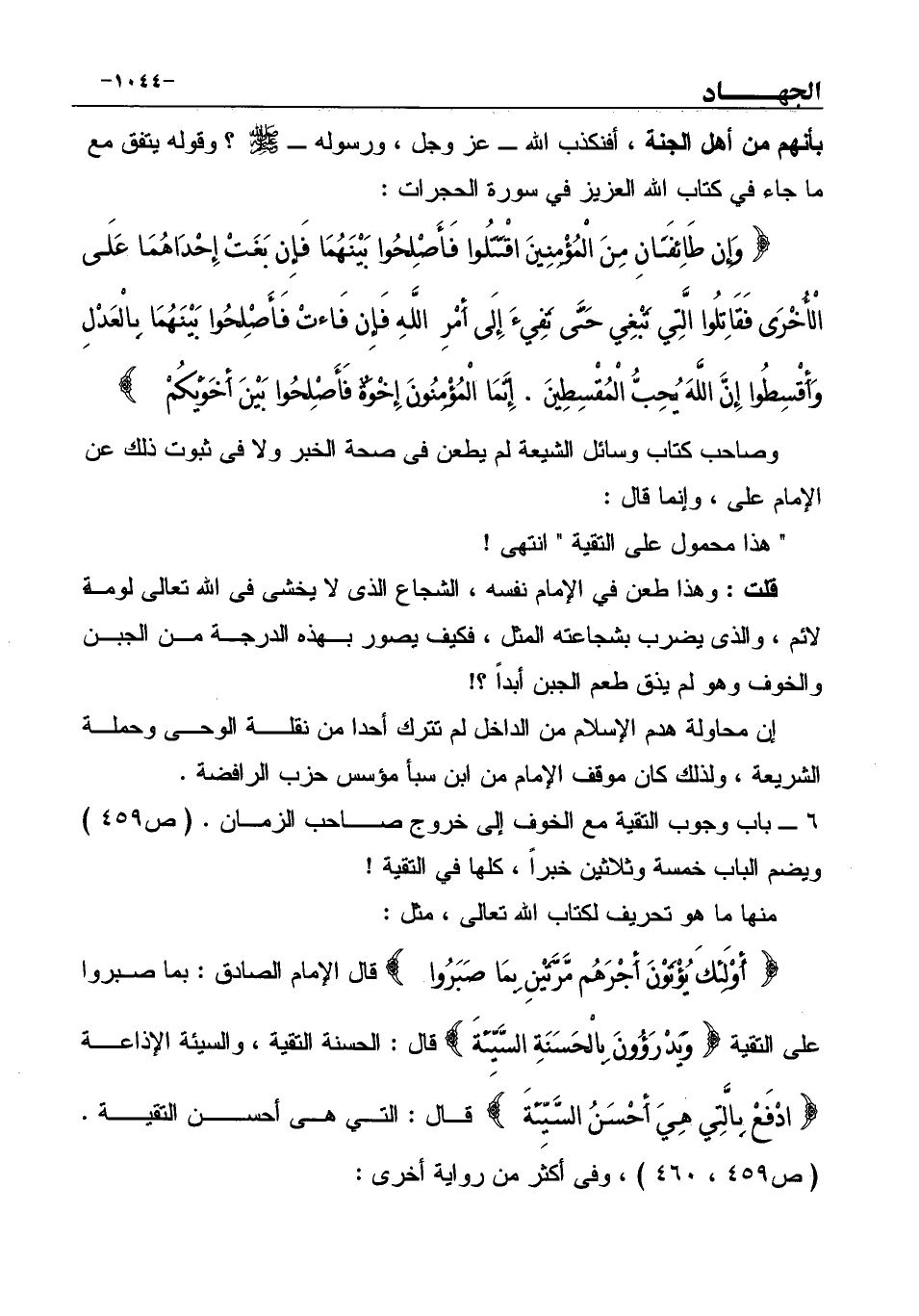 6 ـ باب وجوب التقية مع الخوف إلى خروج صاحب الزمان. (ص459) ويضم الباب خمسة وثلاثين خبراً، كلها في التقية!