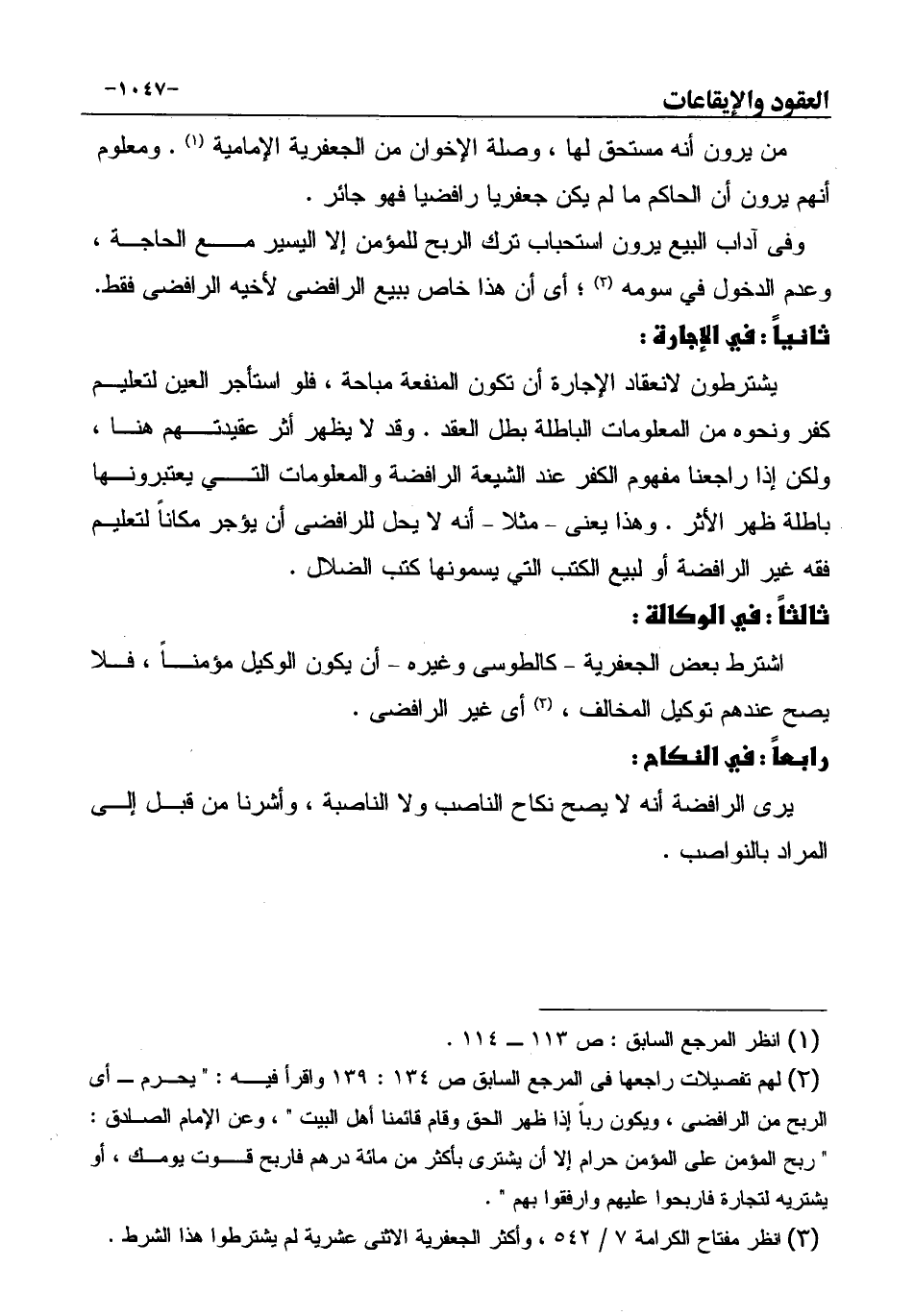 (¬2) لهم تفصيلات راجعها فى المرجع السابق ص 134: 139 واقرأ فيه: " يحرم ـ أي الربح من الرافضي، ويكون رباً إذا ظهر الحق وقام قائمنا أهل البيت "، وعن الإمام الصادق: " ربح المؤمن على المؤمن حرام إلا أن يشترى بأكثر من مائة درهم فاربح قوت يومك، أو يشتريه لتجارة فاربحوا عليهم وارفقوا بهم ".