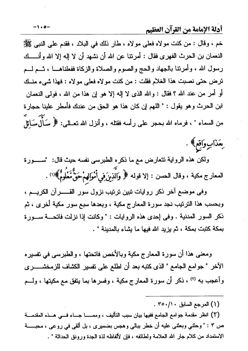 خم، وقال: من كنت مولاه فعلى مولاه، طار ذلك في البلاد، فقدم على النبي صَلَّى اللهُ عَلَيْهِ وَسَلَّمَ النعمان بن الحرث الفهرى فقال: أمرتنا عن الله أن نشهد أن لا إله إلا الله وأنك رسول الله، وأمرتنا بالجهاد والحج والصوم والصلاة والزكاة ففعلناها، ثم لم ترض حتى نصبت هذا الغلام فقلت: من كنت مولاه فعلى مولاه: فهذا شىء منك أو أمر من عند الله؟ فقال: والله الذي لا إله إلا هو إن هذا من الله، فولى النعمان ابن الحرث وهو يقول: " اللهم إن كان هذا هو الحق من عندك فأمطر علينا حجارة من السماء "، فرماه الله بحجر على رأسه فقتله، وأنزل الله تعالى: " سَأَلَ سَائِلٌ بِعَذَابٍ وَاقِعٍ".