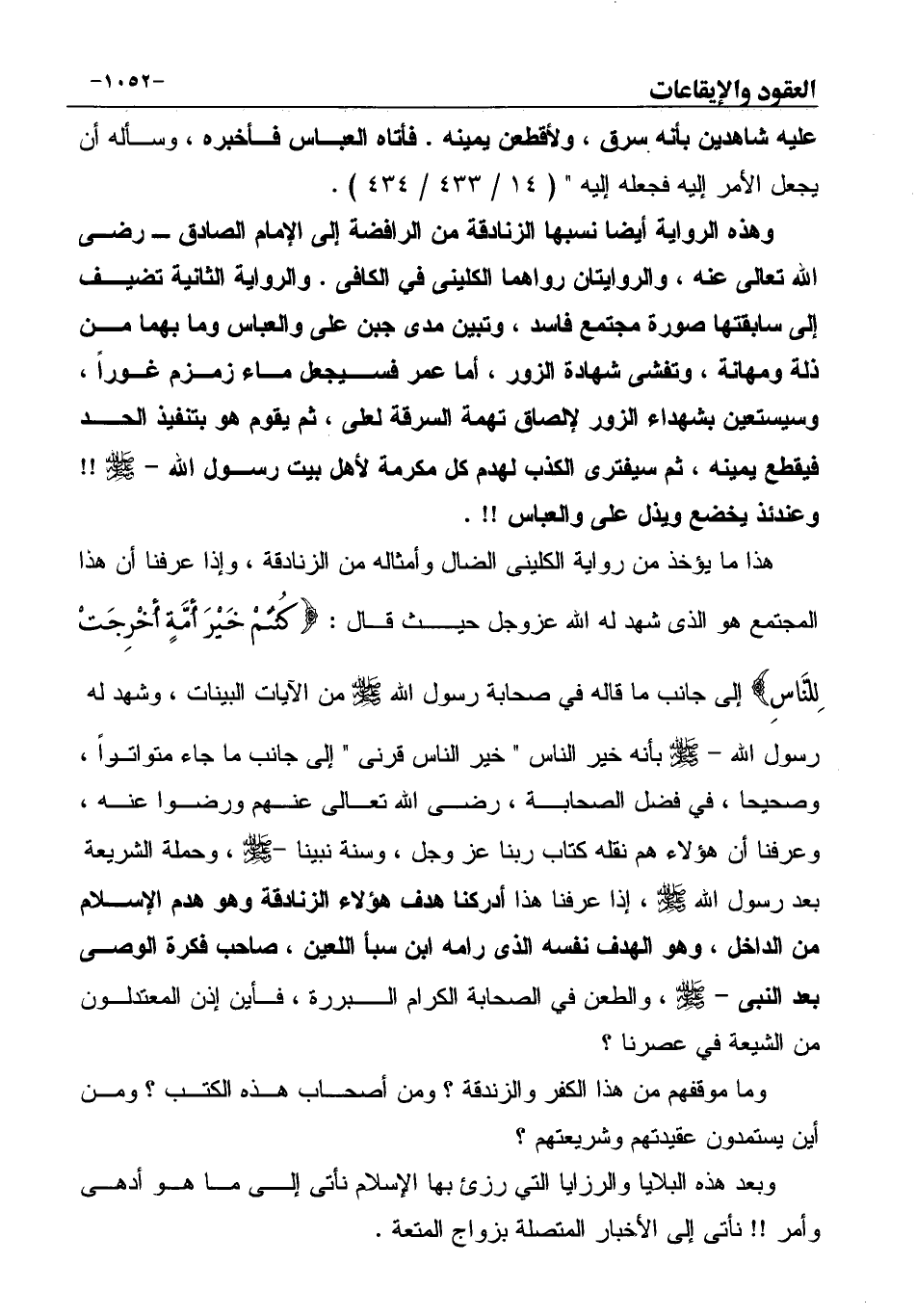 هذا ما يؤخذ من رواية الكليني الضال وأمثاله من الزنادقة، وإذا عرفنا أن هذا المجتمع هو الذى شهد له الله عزوجل حيث قال: "" كُنتُمْ خَيْرَ أُمَّةٍ أُخْرِجَتْ لِلنَّاسِ"" إلى جانب ما قاله في صحابة رسول الله - صَلَّى اللهُ عَلَيْهِ وَسَلَّمَ - من الآيات البينات، وشهد له رسول الله - صَلَّى اللهُ عَلَيْهِ وَسَلَّمَ - بأنه خير الناس " خير الناس قرنى " إلى جانب ما جاء متواتراً، وصحيحا، في فضل الصحابة، رضي الله تعالى عنهم ورضوا عنه، وعرفنا أن هؤلاء هم نقله كتاب ربنا عز وجل، وسنة نبينا - صَلَّى اللهُ عَلَيْهِ وَسَلَّمَ -، وحملة الشريعة بعد رسول الله - صَلَّى اللهُ عَلَيْهِ وَسَلَّمَ -، إذا عرفنا هذا أدركنا هدف هؤلاء الزنادقة وهو هدم الإسلام من الداخل، وهو الهدف نفسه الذى رامه ابن سبأ اللعين، صاحب فكرة الوصى بعد النبى - صَلَّى اللهُ عَلَيْهِ وَسَلَّمَ -، والطعن في الصحابة الكرام البررة، فأين إذن المعتدلون من الشيعة في عصرنا؟