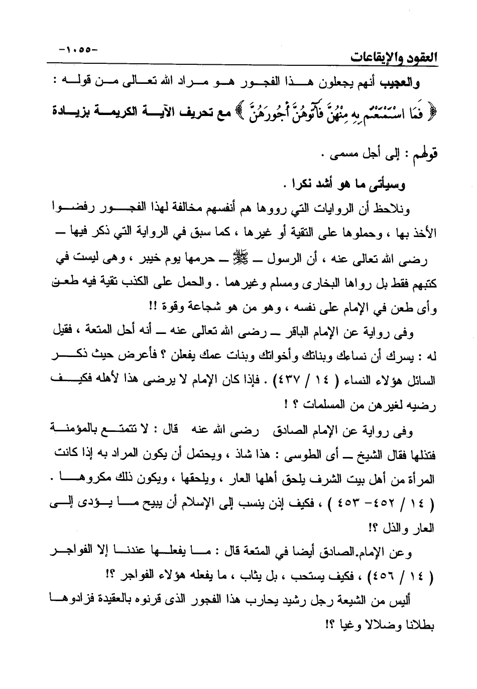 والعجيب أنهم يجعلون هذا الفجور هو مراد الله تعالى من قوله: "" فَمَا اسْتَمْتَعْتُم بِهِ مِنْهُنَّ فَآتُوهُنَّ أُجُورَهُنَّ "" مع تحريف الآية الكريمة بزيادة قولهم: إلى أجل مسمى.