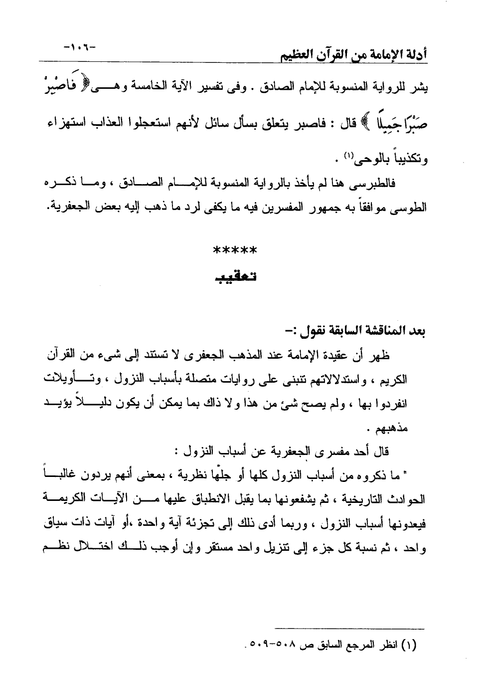 ظهر أن عقيدة الإمامة عند المذهب الجعفرى لا تستند إلى شىء من القرآن الكريم، واستدلالاتهم تنبنى على روايات متصلة بأسباب النزول، وتأويلات انفردوا بها، ولم يصح شئ من هذا ولا ذاك بما يمكن أن يكون دليلاً يؤيد مذهبهم.