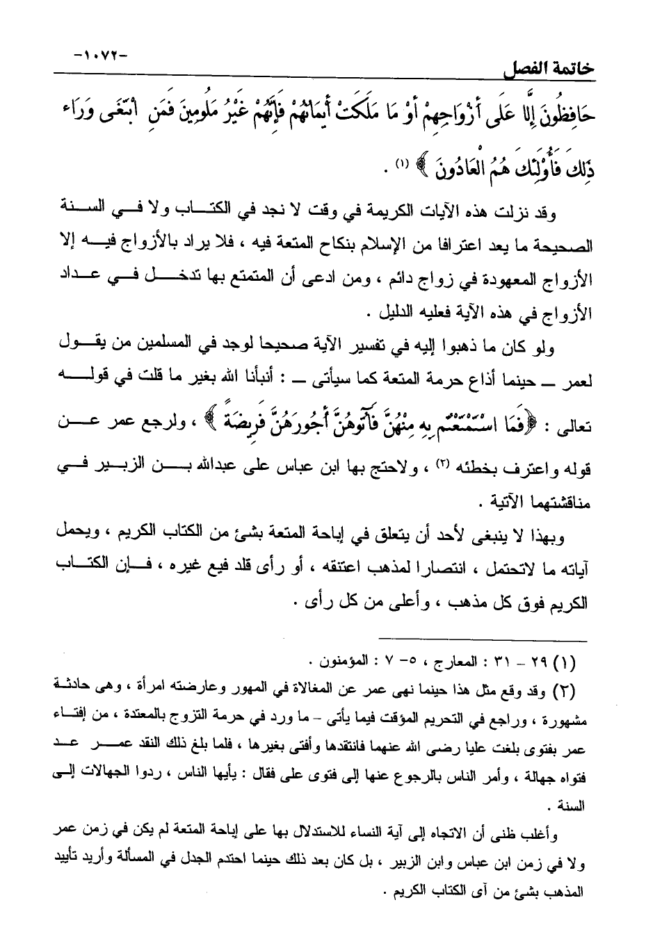 وبهذا لا ينبغى لأحد أن يتعلق في إباحة المتعة بشئ من الكتاب الكريم، ويحمل آياته ما لاتحتمل، انتصارا لمذهب اعتنقه، أو رأي قلد فيع غيره، فإن الكتاب الكريم فوق كل مذهب، وأعلى من كل رأي.