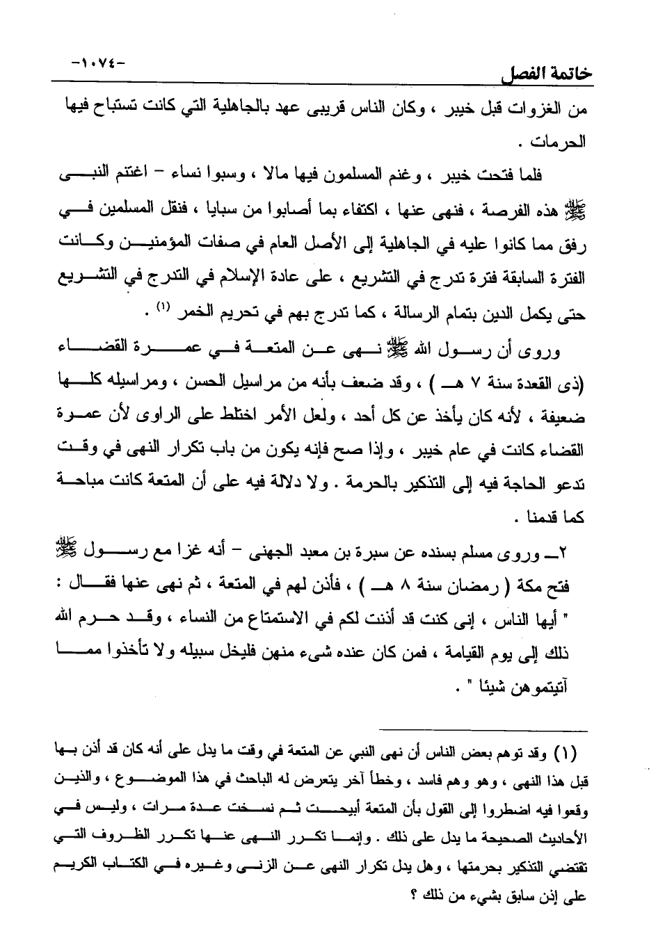(¬1) وقد توهم بعض الناس أن نهي النبي عن المتعة في وقت ما يدل على أنه كان قد أذن بها قبل هذا النهي، وهو وهم فاسد، وخطأ آخر يتعرض له الباحث في هذا الموضوع، والذين وقعوا فيه اضطروا إلى القول بأن المتعة أبيحت ثم نسخت عدة مرات، وليس في الأحاديث الصحيحة ما يدل على ذلك. وإنما تكرر النهي عنها تكرر الظروف التي تقتضي التذكير بحرمتها، وهل يدل تكرار النهي عن الزنى وغيره في الكتاب الكريم ... على إذن سابق بشيء من ذلك؟