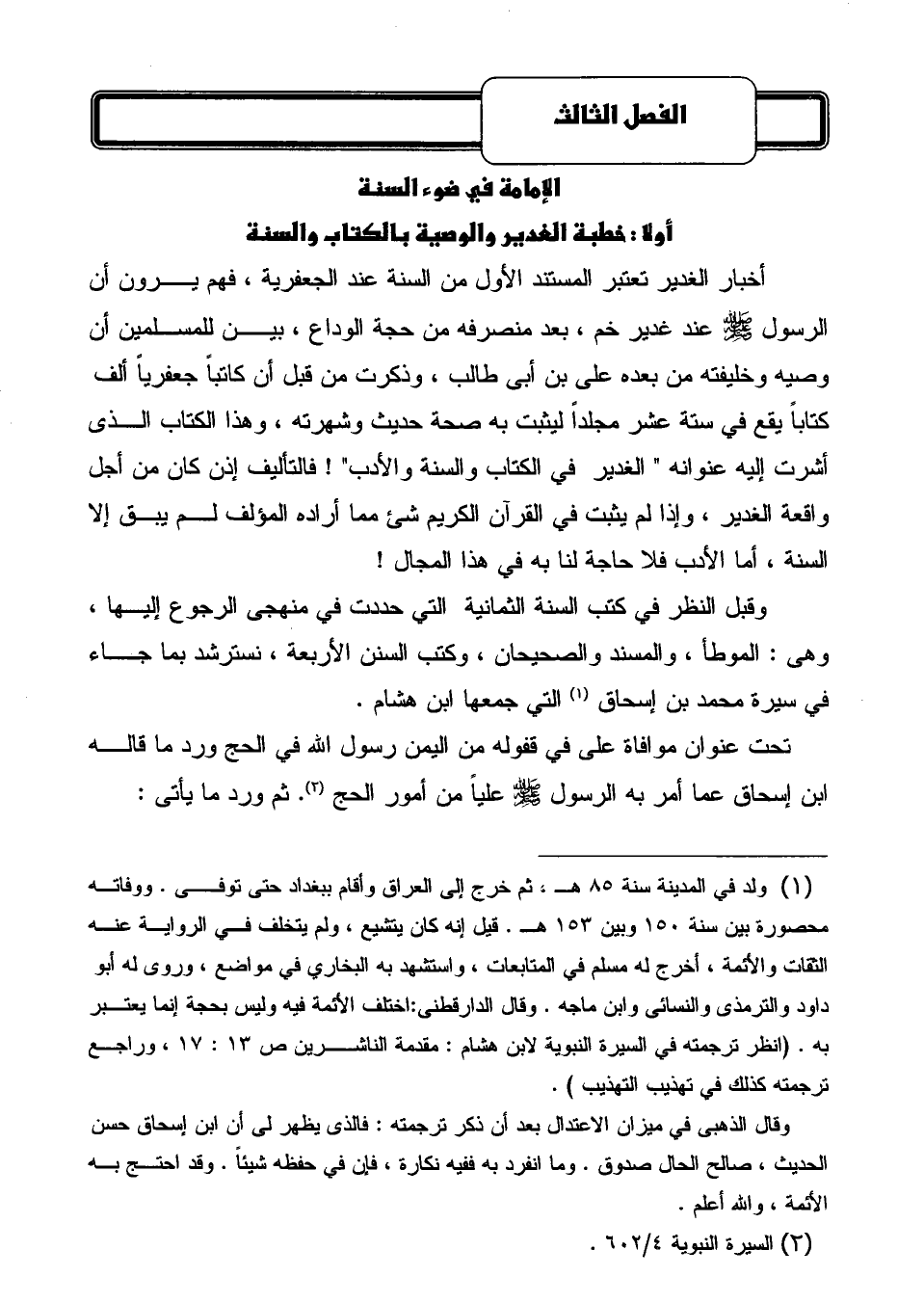 أخبار الغدير تعتبر المستند الأول من السنة عند الجعفرية، فهم يرون أن الرسول صَلَّى اللهُ عَلَيْهِ وَسَلَّمَ عند غدير خم، بعد منصرفه من حجة الوداع، بين للمسلمين أن وصيه وخليفته من بعده على بن أبى طالب، وذكرت من قبل أن كاتباً جعفرياً ألف كتاباً يقع في ستة عشر مجلداً ليثبت به صحة حديث وشهرته، وهذا الكتاب الذي أشرت إليه عنوانه " الغدير في الكتاب والسنة والأدب"! فالتأليف إذن كان من أجل واقعة الغدير، وإذا لم يثبت في القرآن الكريم شئ مما أراده المؤلف لم يبق إلا السنة، أما الأدب فلا حاجة لنا به في هذا المجال!