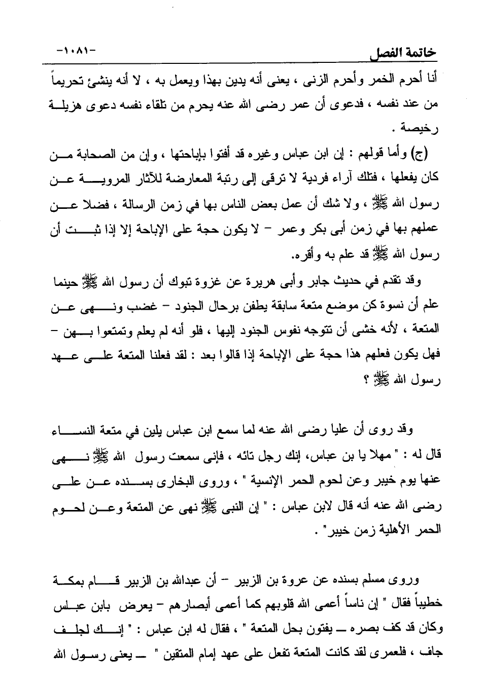 (ج) وأما قولهم: إن ابن عباس وغيره قد أفتوا بإباحتها، وإن من الصحابة من كان يفعلها، فتلك آراء فردية لا ترقى إلى رتبة المعارضة للآثار المروية عن رسول الله - صَلَّى اللهُ عَلَيْهِ وَسَلَّمَ -، ولا شك أن عمل بعض الناس بها في زمن الرسالة، فضلا عن عملهم بها في زمن أبى بكر وعمر - لا يكون حجة على الإباحة إلا إذا ثبت أن رسول الله - صَلَّى اللهُ عَلَيْهِ وَسَلَّمَ - قد علم به وأقره.
